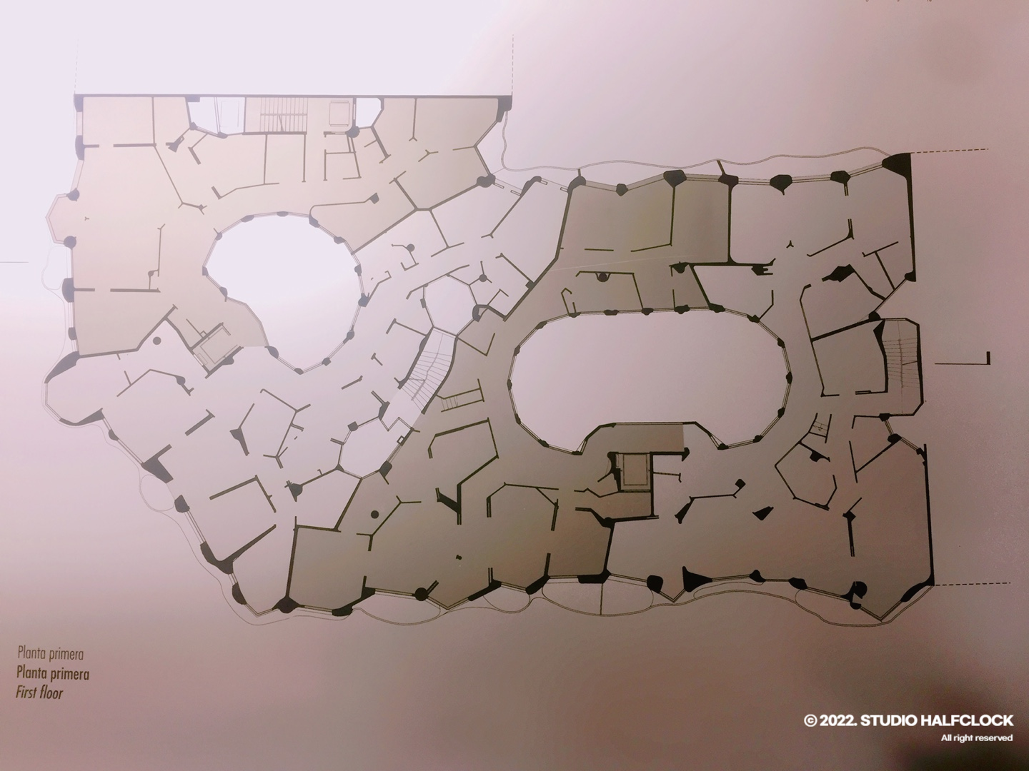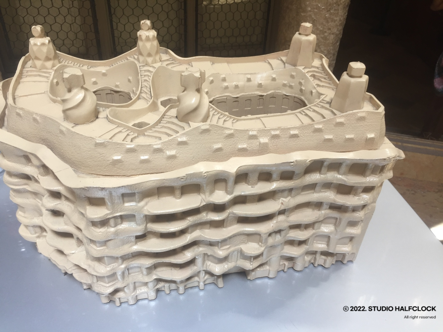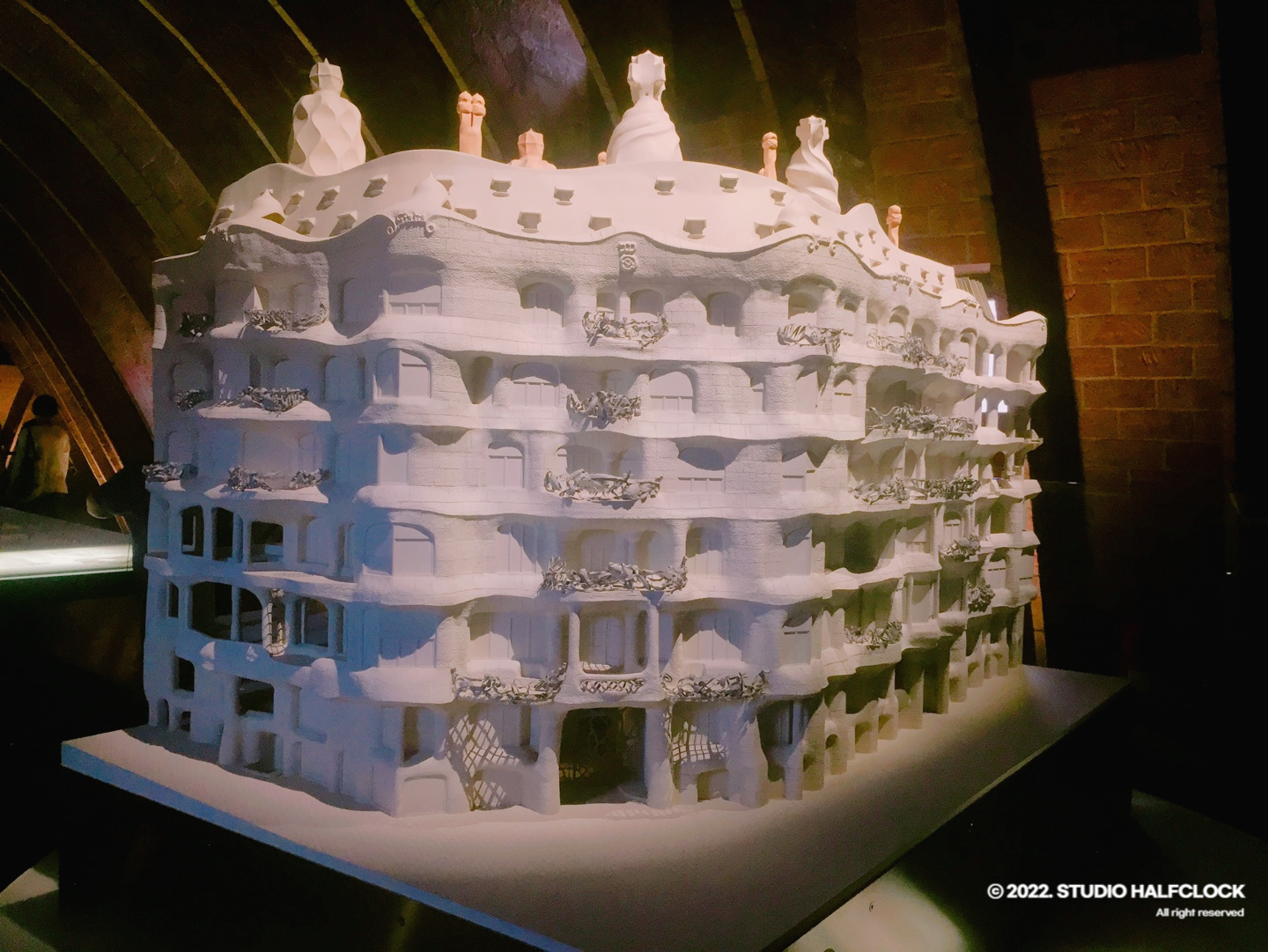 까사밀라 내부에는 까사밀라의 도면과 모형이 전시되어있다. 1층 도면을 보면 가우디가 설계할 때 수직 수평을 맞춘 것이 없는 것을 알 수 있다. 흔히 설계할 때 지금까지도 수직 수평이 많이 강조되는데, 이보다 훨씬 전인 과거에 저렇게 자유로운 평면도를 그릴 수 있었던 건 가우디가 정말 천재라서 가능한 것이 아닐까 생각이 든다.