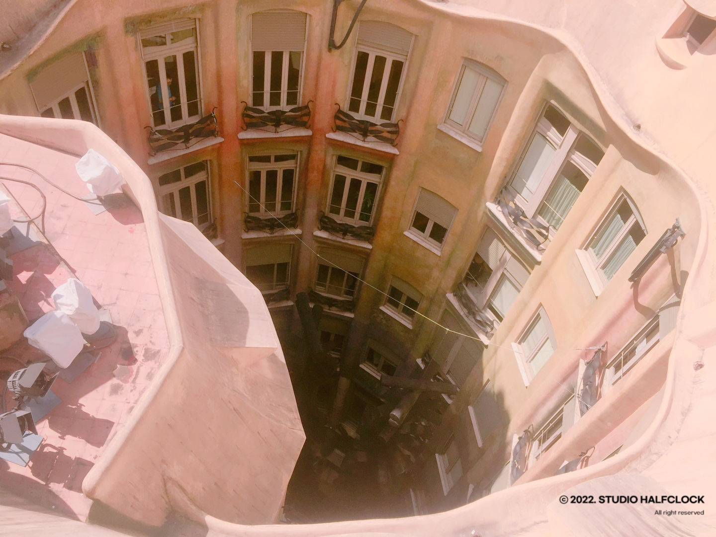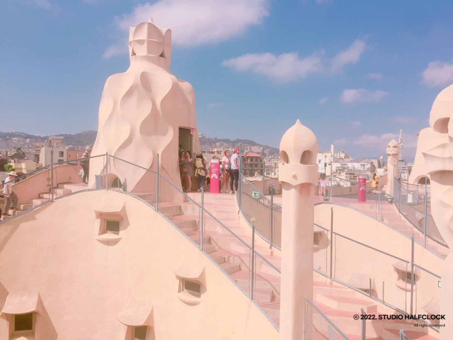 까사밀라의 옥상은 외부인들에게 완전히 개방되어 있어서 구경하기 좋았다. 위아래로 파도치는 듯한 계단을 통해 가우디가 수평 수직적으로 '직선'을 쓴 요소가 거의 없다는 것을 알 수 있다. 굴뚝 디자인을 보면 건축가 가우디가 정말 섬세하게 디자인한 것을 알 수 있다. 실제로 이 굴뚝 디자인도 가우디가 직접 해서 만들었다고 한다.