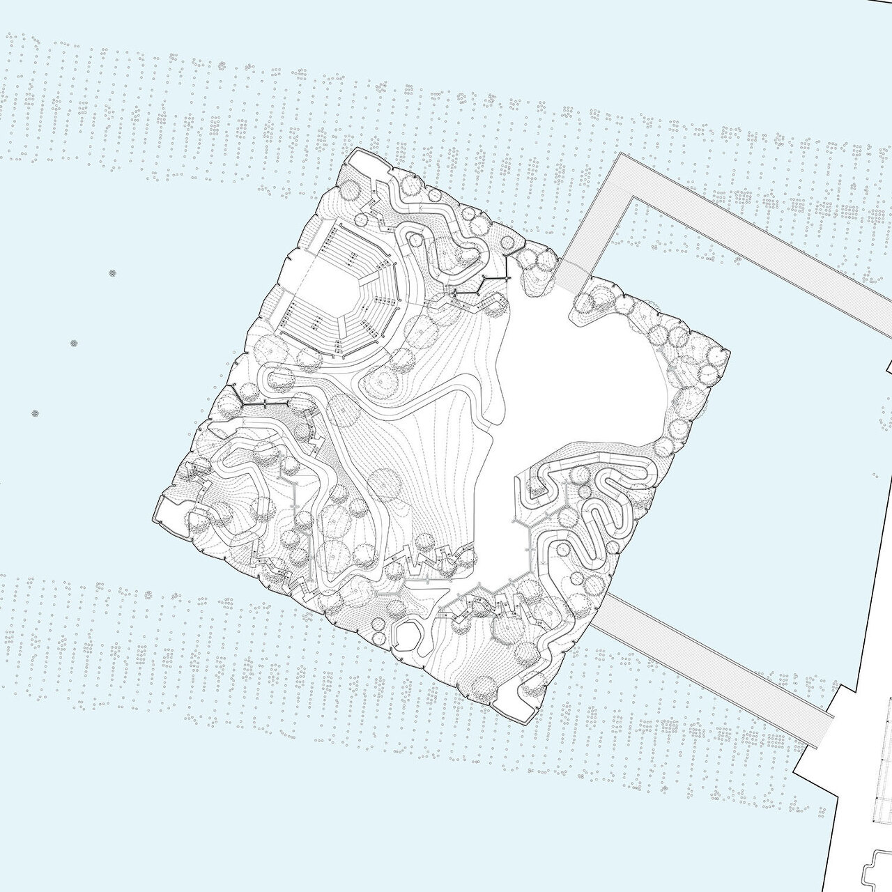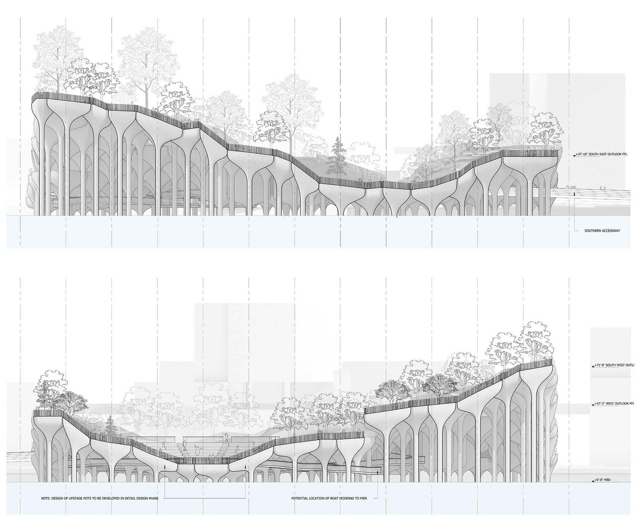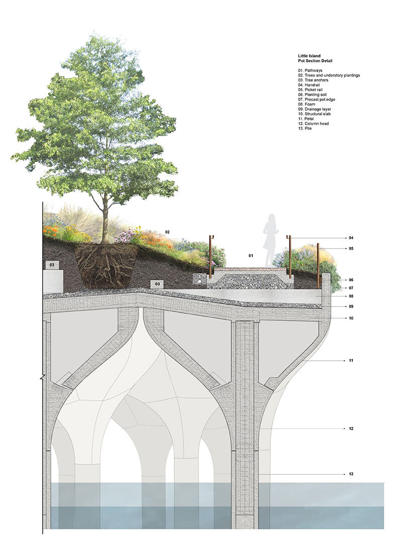 구조 형태 디자인: 강 밑부분의 화강암과 새로운 콘크리트 말뚝을 연결하는 132개의 개별 말뚝이 모여 공원의 지형을 형성한다. Precast Concrete Planters는 모듈식 "꽃잎"으로 구성된다. 각각 350톤까지 지탱할 수 있는 말뚝으로 물속 61m 깊이의 바위에 깊이 박혀있다.