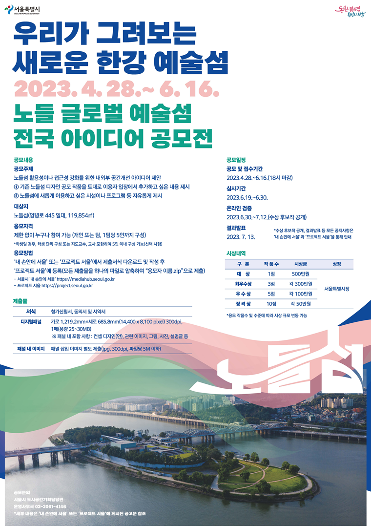 용산 노들섬에 문화예술.조망시설을 조성하는 서울시의 첫 혁신 디자인 시범사업인 '노들 글로벌 예술섬 조성사업'은 예상 공사비 약 2557억원, 설계비 약 140억원이 걸린 대규모 공모로 화제가 되었습니다.