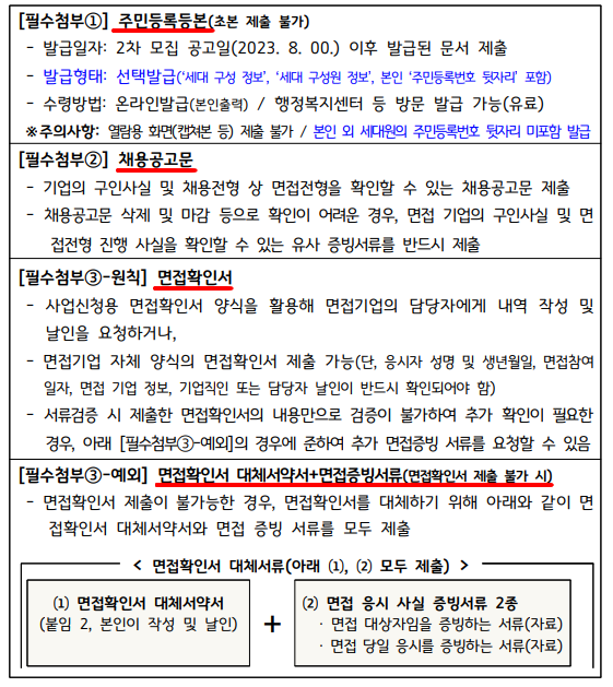 - 필수제출 서류 3가지: 주민등록등본, 채용공고문, 면접확인서 or 면접확인서 대체 서약서 + 증빙서류 2종