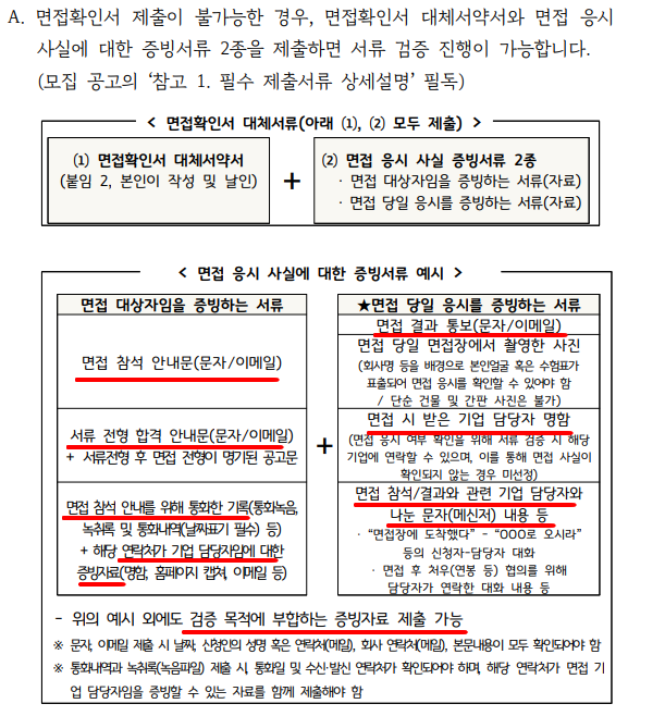 - 면접확인서 대체서약서와 면접 응시 사실에 대한 증빙서류 2종을 제출하면 서류 검증 진행이 가능