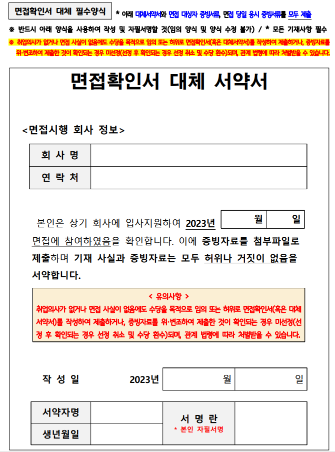사실 예전 면접확인서를 회사에서 받아내기란 쉽지 않은데요, 빨리 주는 경우도 없고 귀찮아서 안주는 경우도 많아서 만약 회사에서 면접확인서를 받기 어려운 경우에는 대체서약서와 면접 응시 사실에 대한 증빙서류 2종을 제출하면 됩니다.