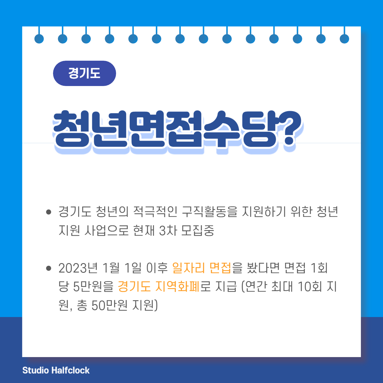 경기도 청년의 적극적인 구직활동을 지원하기 위한 '경기도 청년 면접수당' 지원대상자 3차 모집을 하고 있습니다. 경기도 내 거주하는 18세 이상 39세 이하의 청년들 중, 2023년 1월 1일 이후 일자리 면접을 봤다면 면접 1회당 5만 원을 경기도 지역화폐로 지급해 줍니다. 면접에 사용된 비용을 보전해 줌으로 경제적 부담을 경감해 주고 적극적인 구직활동을 증진시키는 목적의 청년지원 사업입니다. 관련 자세한 내용은 아래 링크 참고해 주세요.