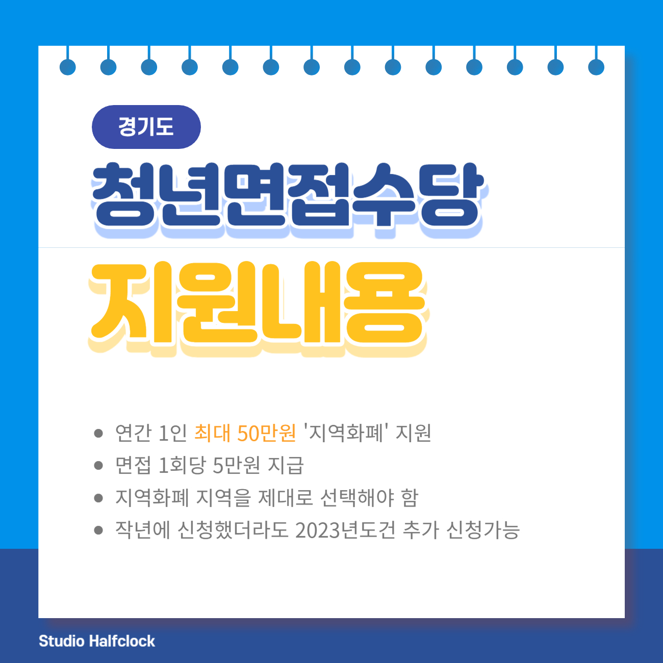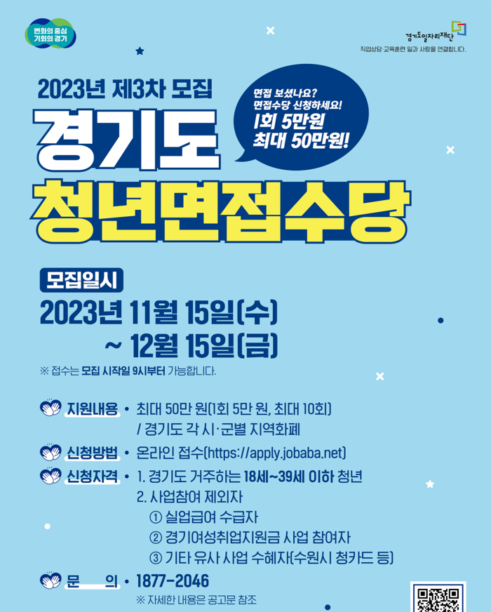 경기도 청년의 적극적인 구직활동을 지원하기 위한 '경기도 청년 면접수당' 지원대상자 3차 모집을 하고 있습니다. 경기도 내 거주하는 18세 이상 39세 이하의 청년들 중, 2023년 1월 1일 이후 일자리 면접을 봤다면 면접 1회당 5만 원을 경기도 지역화폐로 지급해 줍니다. 면접에 사용된 비용을 보전해 줌으로 경제적 부담을 경감해 주고 적극적인 구직활동을 증진시키는 목적의 청년지원 사업입니다. 관련 자세한 내용은 아래 링크 참고해 주세요.