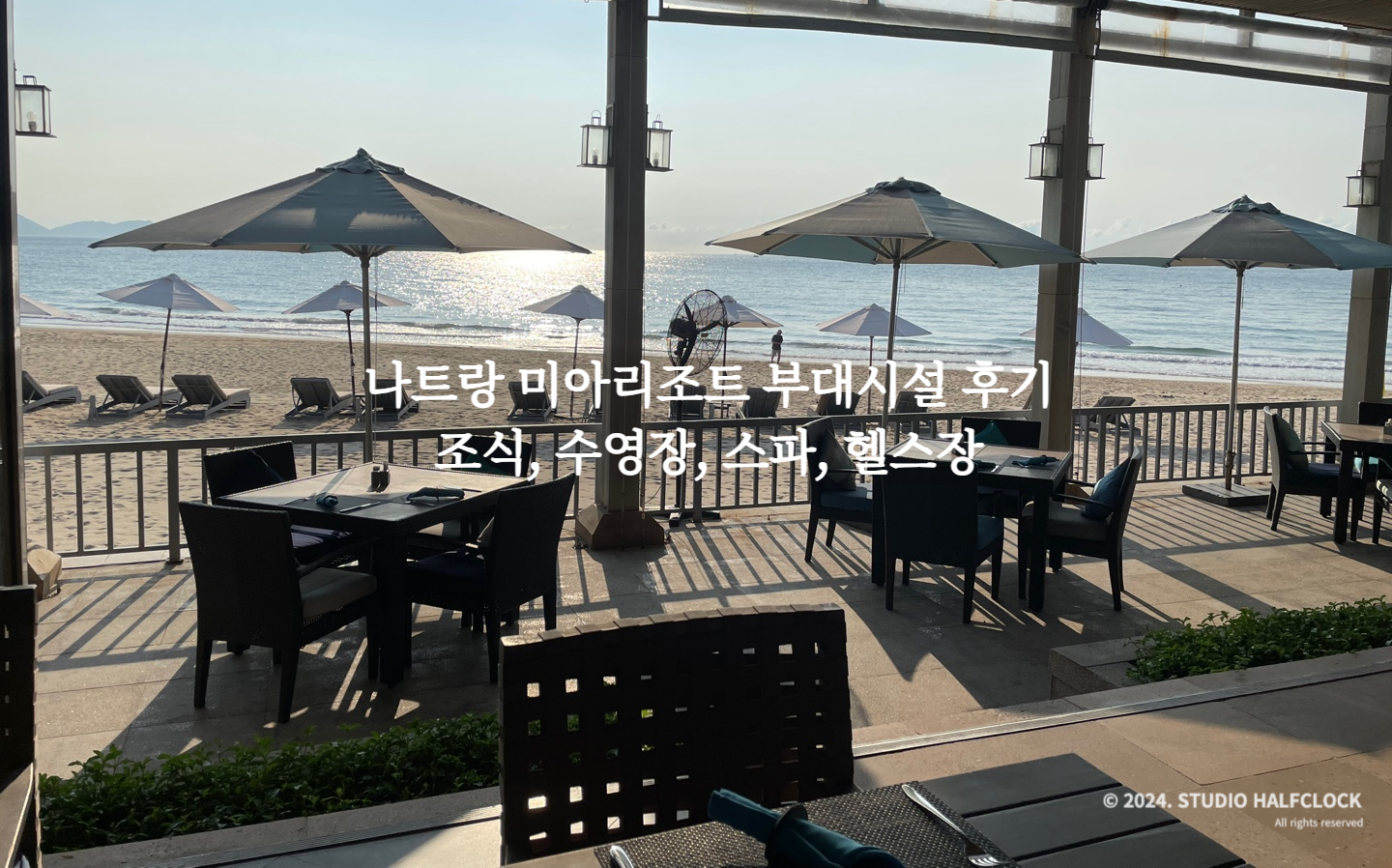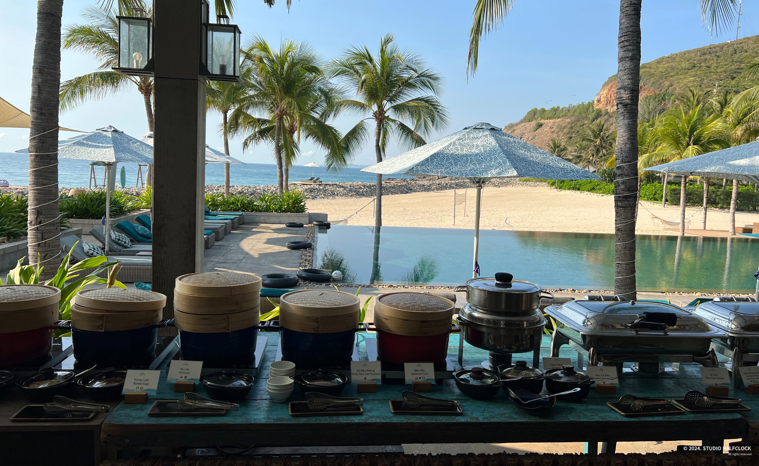 조식 먹는곳은 메인수영장 바로 옆에 위치하고 있습니다. 나트랑을 4월에 방문했는데 이 때 날씨가 꽤 더웠어요. 오전에 더 더운느낌? 근데 조식먹는 곳이 뷰를 너무 중요하게 생각해서 그런지 문을 다 열어놨습니다. 실내에는 에어컨이 없었음. 안 튼 건가 아무튼 진짜 밥 먹는데 더워죽는 줄.. 뷰는 끝내주지만 위생을 생각해서 문을 좀 닫고 쾌적하게 먹을 수 있었으면 더 좋았을 듯..