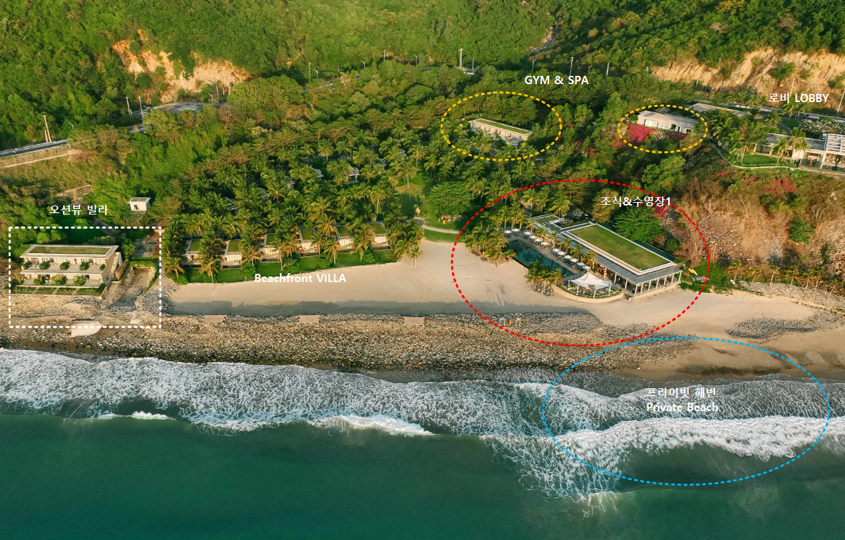 부대시설 위치설명을 위해 미아리조트 공식홈페이지의 항공뷰를 가져왔습니다. 중앙에 위치한 로비를 기준으로 왼쪽에 있는 부대시설로 조식&수영장 그 앞에 프라이빗 해변, 헬스장과 스파 이렇게 있습니다. 제가 선택한 룸은 오션뷰 빌라로 가장 왼쪽에 위치해 있는데 여기서 조식먹는곳(수영장)까지 걸어서 2~3분정도 걸리니 갈 때마다 버기 안 불러도 됩니다. 모르고 한 번 불렀다가 그냥 걸어가라길래 그렇게 가깝나 싶었는데 진짜 가까움..