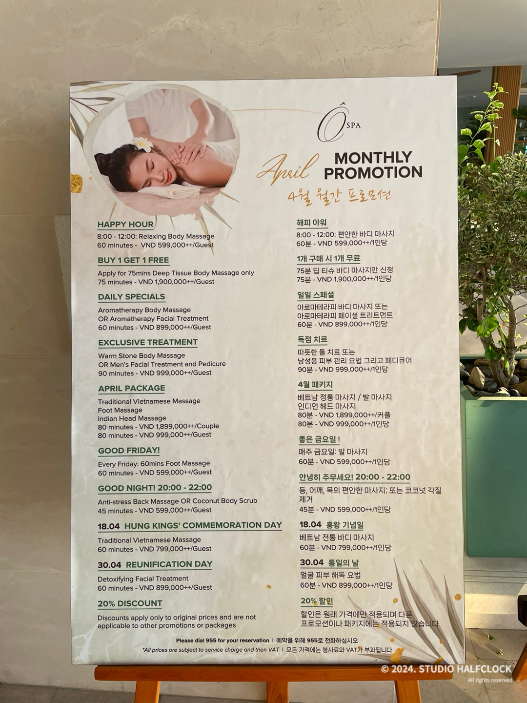 스파는.. 안 가봤다. 사실 나트랑 시내에 정말 너무너무 마사지 잘하는 스파를 찾아서 굳이..? 리조트에서 받지 않은 듯. 스파는 헬스장에서 조금 더 위로 올라가면 있고 가격은 한국이랑 비슷하다 생각하시면 됩니다. 4월에 방문했는데 프로모션을 하고 있었다. 월별 프로모션이니 매달 달라지는 걸 수도..!?