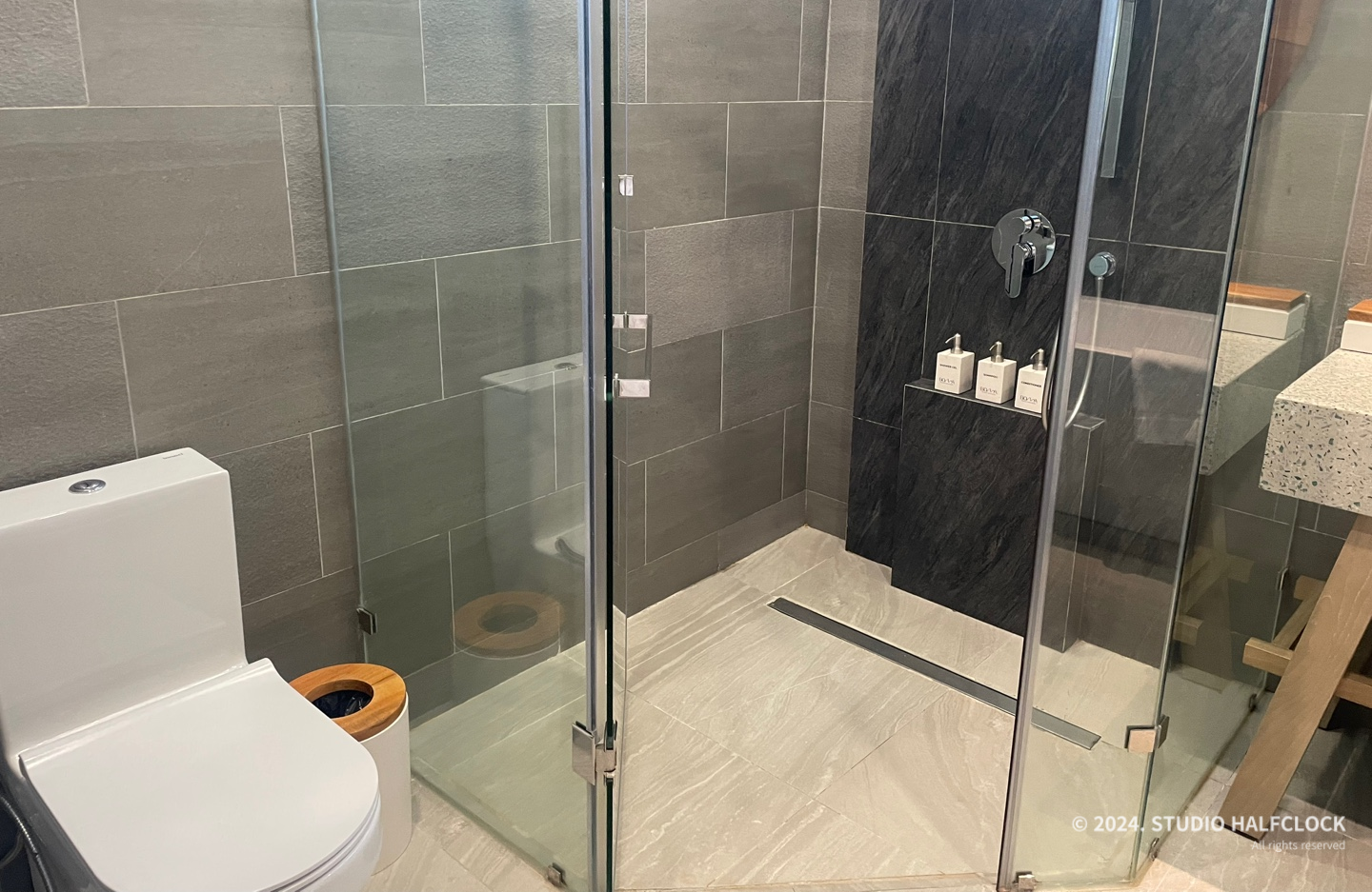 샤워실 안에 샴푸, 린스, 바디워시가 있는데 큰 통에 담겨있으니 조금 찝찝합니다. 샴푸 린스 바디워시는 챙겨 오는 걸 추천드려요. 그리고 샤워볼 챙겨야 함! 없습니다.