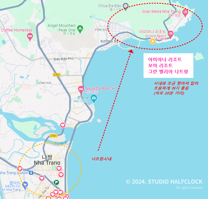 나트랑 시내를 왔다갔다 하기 좋은 위치에 있지만 동시에 조용히 호캉스하기 좋습니다. 아미아나 리조트가 가장 유명(스노쿨링 가능)하며 보마리조트는 해변이 없지만 아미아나는 아주 작게 있음.