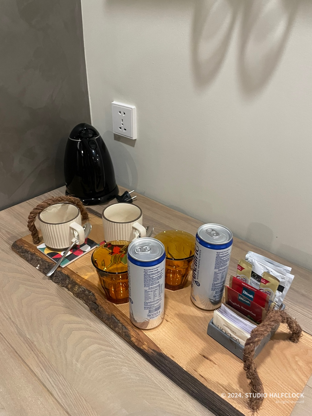 특이한 점! 물이 캔으로 되어있음. 이거 좀 불편했어요. 캔으로 한번 따면 얼마 남았는지도 안 보이고 입 두 번 대기 싫은... 컵을 이용하게 됩니다. 냉장고에 맛있어 보이는 초콜릿 있어서 나도 모르게 먹을 뻔.. 위에 있는 차 종류들은 무료로 다 먹어도 되지만 냉장고는 돈 내야 합니다! (콜라하나 먹음)