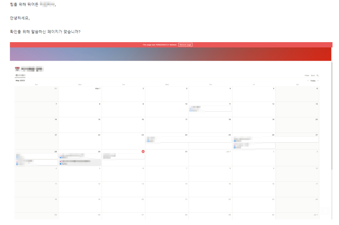 요새 노션(Notion)으로 계획표 짜면서 이것저것 해보는 거에 재미를 느껴 여러 가지 시도해 보다가 저도 모르게 페이지를 영구삭제하게 되었습니다. 페이지를 그냥 휴지통에 넣는 건 줄 알았는데 영구삭제였음...^^ 거의 3~4시간 동안 만든 페이지이고 그 안에 데이터까지 다 날아가서 거의 울기 직전에 포기할 수 없어서 노션에 복구해 달라고 요청했습니다.