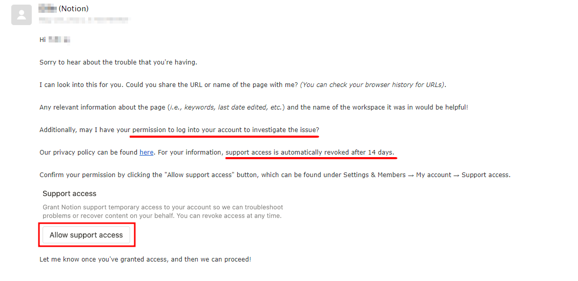 그렇게 되면 메일로 "Allow support access" 버튼을 클릭하라고 하는데, 이건 노션 측에서 내 데이터에 접근하는 걸 가능하게 하는 절차라고 한다. 버튼을 눌렀는데 제대로 안되었는지 액세스 권한이 아직 부여되지 않았다고 메일이 왔다.