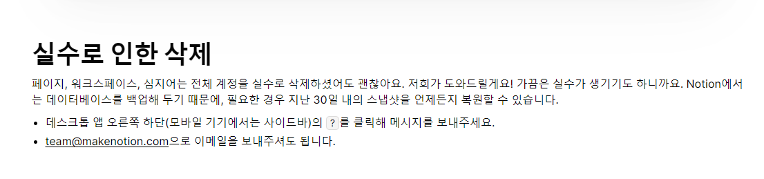 노션은 페이지, 워크스페이스, 심지어 전체 계정을 실수로 삭제했더라도 복구가 가능하다고 합니다.