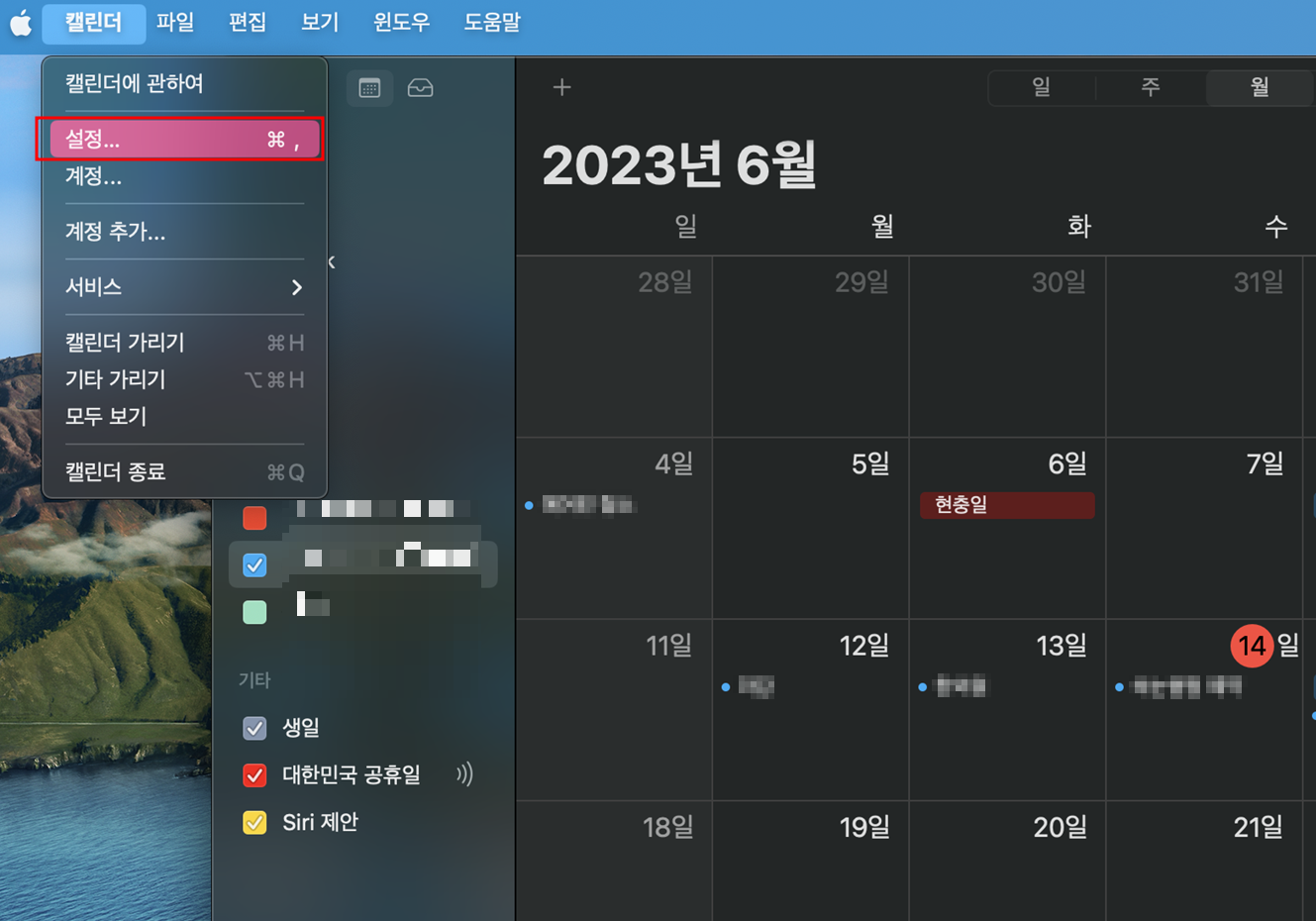 맥북의 캘린더를 켜주시고 설정에 들어가 줍니다.