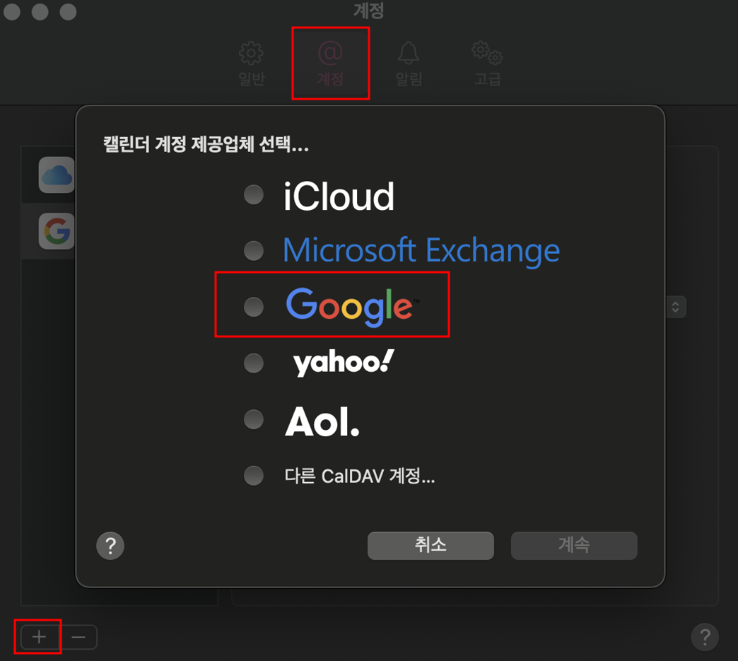 설정 - 캘린더 - 계정 - 계정추가 - 구글