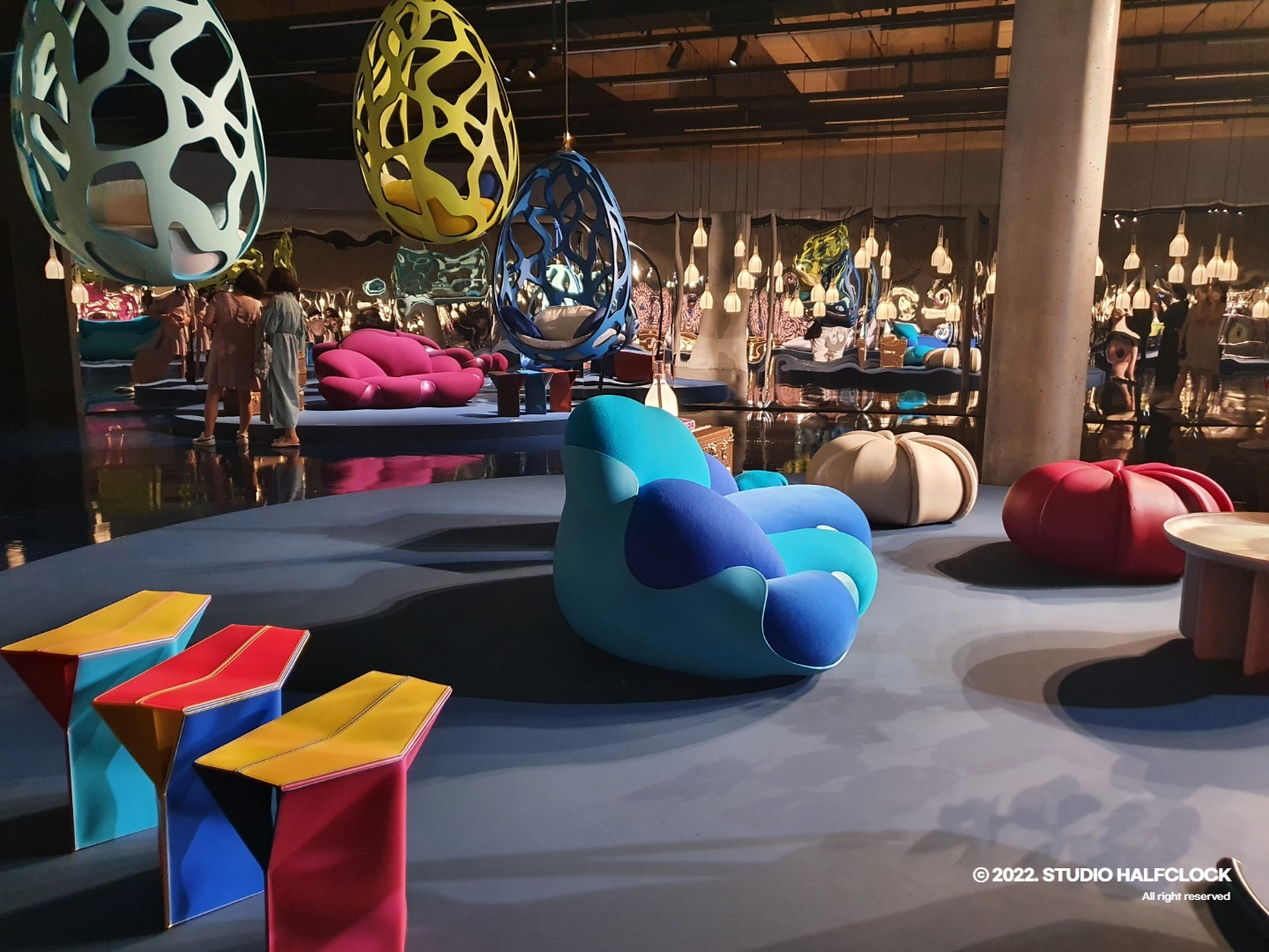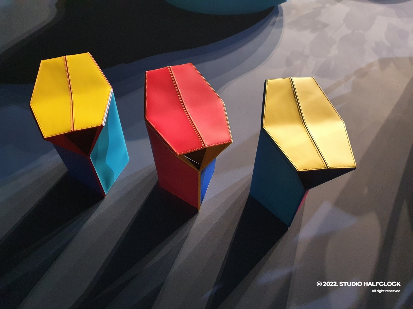 루이비통의 가구 전시는 굉장히 컬러풀했다. 가구들도 색상이 화려했지만 이 가구들이 전시되어 있는 공간은 조명과 색상으로 잘 어울리게 꾸며놓았다. 이 소파는 정말 특이했다. 푹신푹신한 조약돌 느낌이다. 사실 모든 가구가 예술 작품과 같아서 정말 즐겁게 봤다. 벽의 컬러별로 다른 느낌을 주기 때문에 컬러 따라서 구경하는 것도 재밌다.
