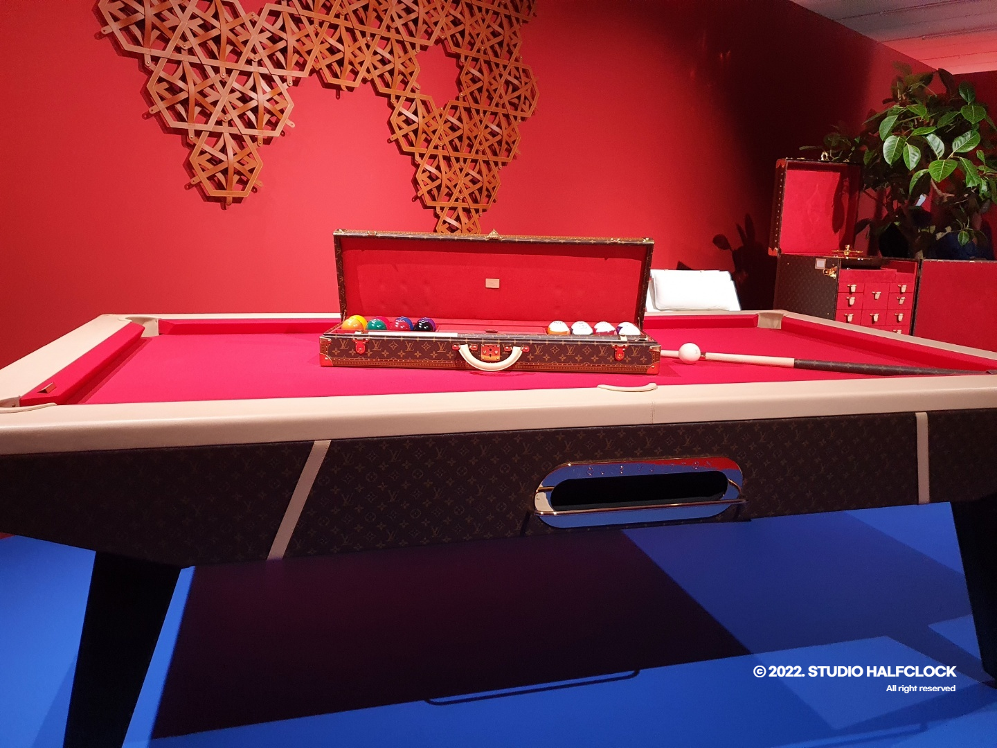 포켓볼 치는 당구대다. 큐대랑 볼을 보관하는 케이스까지 완벽하다. 빨간 벽과 파란색 스테이지, 강렬하다.
