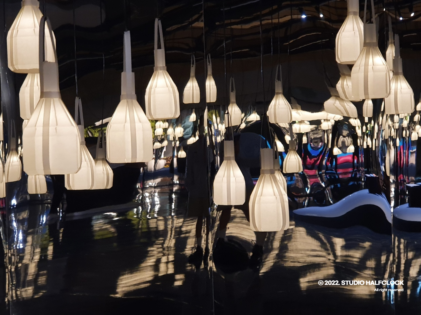 조명과 뒤 배경은 우글거리는 미러다. 어떻게 말로 표현해야 할까, 웨이브 치는? 미러 재질로 자칫하면 정신없어 보이기는 하는데 나름 분위기를 밝혀줬다. 전시의 바깥쪽 벽들에 미러 재질을 써서 벽을 세워, 공간이 확장되는 효과가 있었다. (공간이 훨씬 넓어 보임)