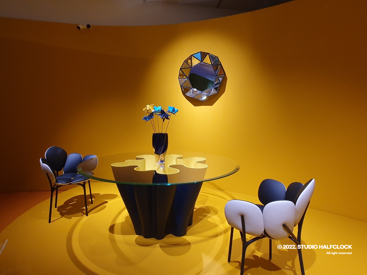 디스플레이도 너무 예술이지만 컬러와 조명 정말 신경 많이 쓴 듯하다. 노란 배경에 진한 남색 느낌의 의자, 완벽하게 계산된 컬러다. 화분의 꽃도 너무 예쁘다. 저것도 디자이너가 디자인한 걸까..?