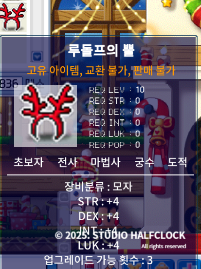 '루돌프의 뿔 아이템' - 모든 능력치 +4/업그레이드 가능 횟수 3