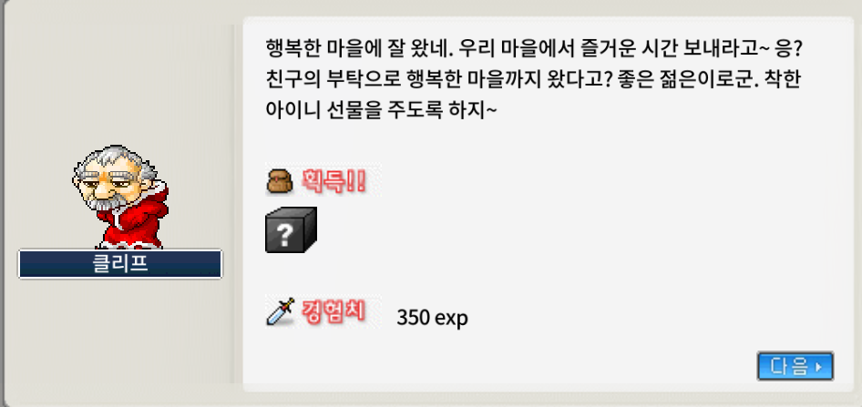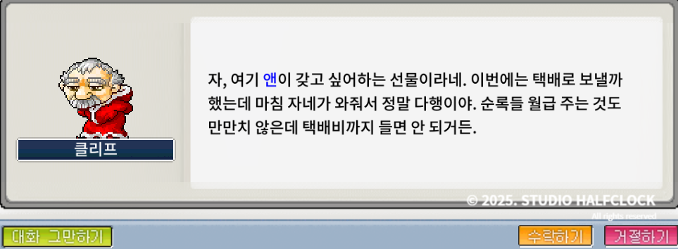 다시 말 걸어서 '클리프가 주는 선물' 퀘스트를 누릅니다.