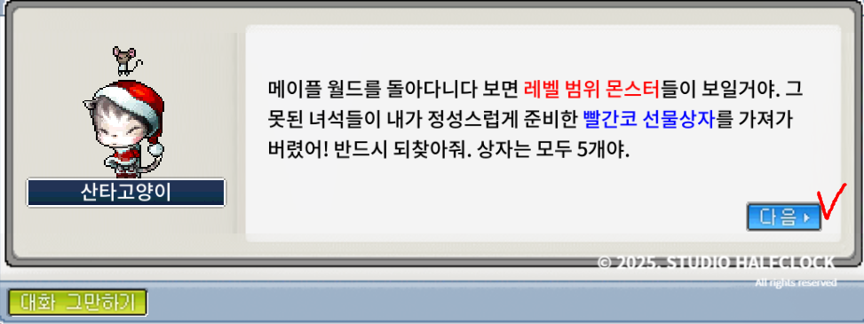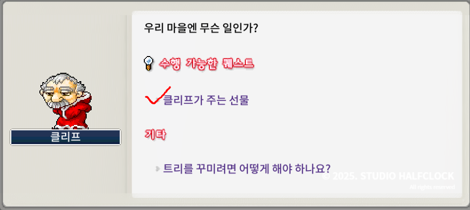 아 벌써 2025년이라니, 메랜관련 글을 쓰려다가 현생 거주지를 옮기는 바람에 메랜 못한 지 너무 오래됐네요. 오랜만에 매랜을 들어와 보니 겨울 이벤트를 진행중인데, 이거 개꿀이라 무조건 해야 합니다. 겨울 이벤트 퀘스트는 총 3개인데요, 일단 접속하니 별이 떠있는데 이거 클릭해 줘서 두 가지 퀘스트 받아주세요! 이 두 가지 퀘스트 (토르의 뿔, 산타고양이 선물상자)는 반복퀘입니다. 이건 좀 나중에 하고, 가장 메인이벤트 '행복한 마을' 이벤트를 해줘야 합니다.
