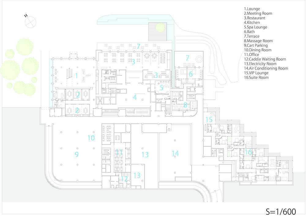 정회원 클럽하우스 건물은 건물 전체를 아우르는 육각형의 나무 격자 조개 지붕 구조로 이루어져 있다. VIP 숙박시설은 주거 규모의 짧은 경간 철골 구조물이다. VIP 회원들의 클럽하우스 건물은 철근콘크리트이다. 메인 클럽하우스의 아트리움 공간은 목재 기둥과 지붕으로 이루어져 있으며, 투명하고 개방된 공간을 제공한다. 방사상으로 배열된 적층된 목재 기둥은 수직 상승하여 곡선으로 되어 육각형 그리드를 형성하는 지붕 평면에서 수평 부재가 된다. 아래 단은 한국의 전통 석조처럼 쌓은 큰 지역 석조 벽으로 지어졌고, 점차 안쪽으로 기울어져 꼭대기를 향하고 있다. 목재 부분의 투명성과 개방성은 접대 공간, 회원 휴게실, 파티룸의 역할을 한다. 석조 연단의 인클로저에는 더 많은 개인 락커룸 구역, 욕실, 스파 및 건물 서비스가 포함되어 있으며 지하에는 주차장이 설치되어 있다.