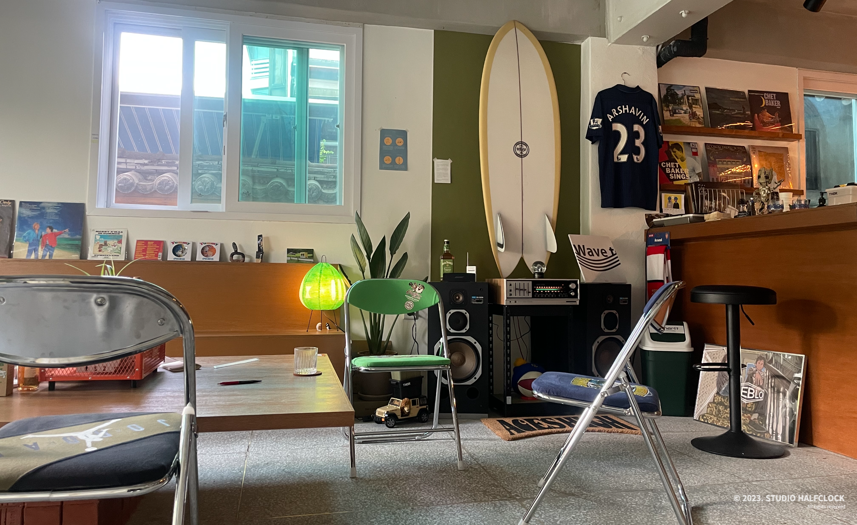 서핑보드, 캠핑의자 등 야외 액티비티 용품들로 인테리어 되어있다.