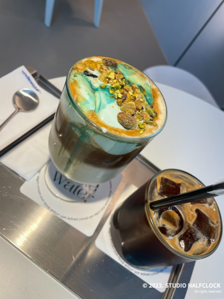 솔티드 카라멜 베이스 우유 + 피스타치오 크림 + 에스프레소