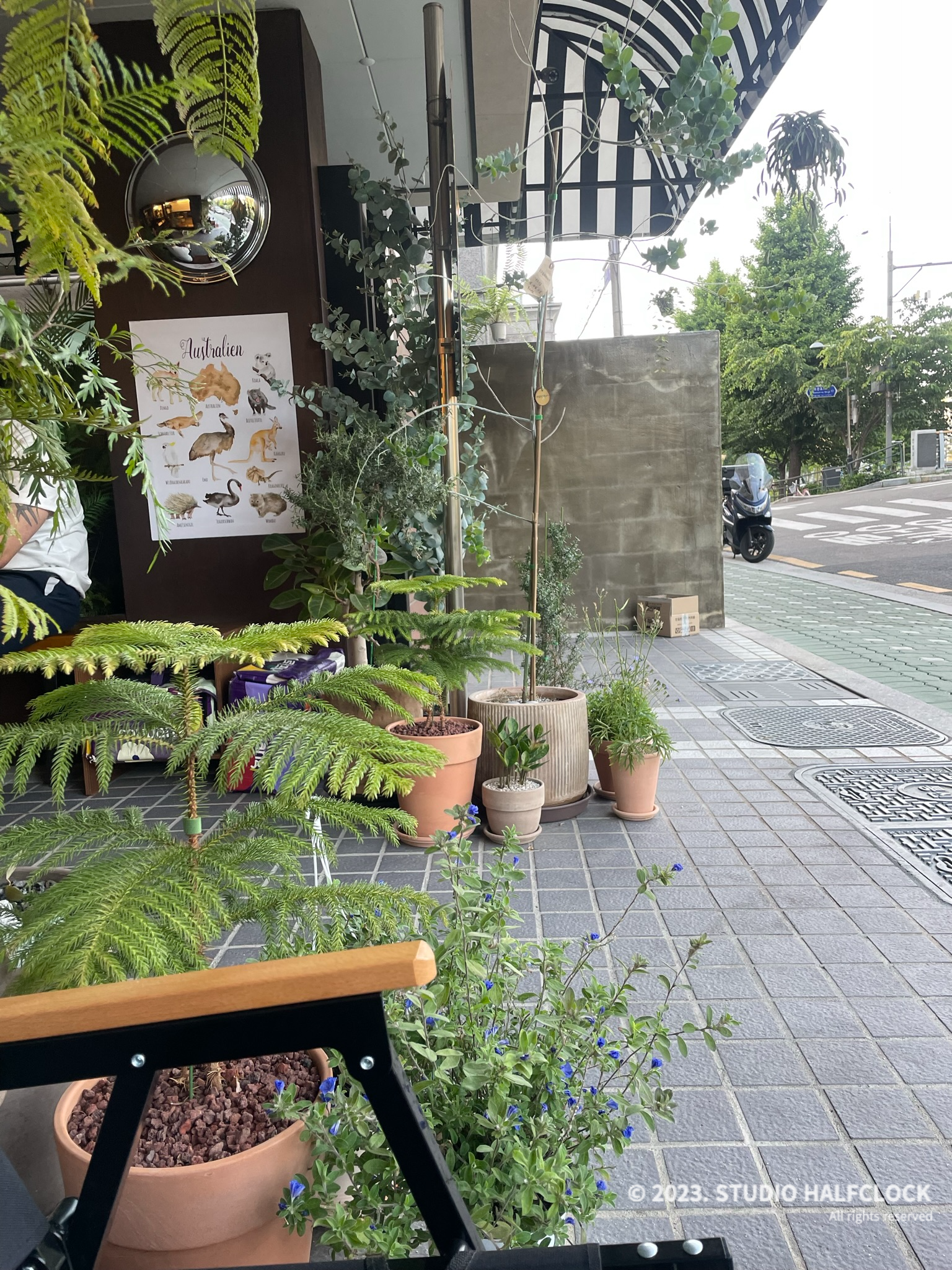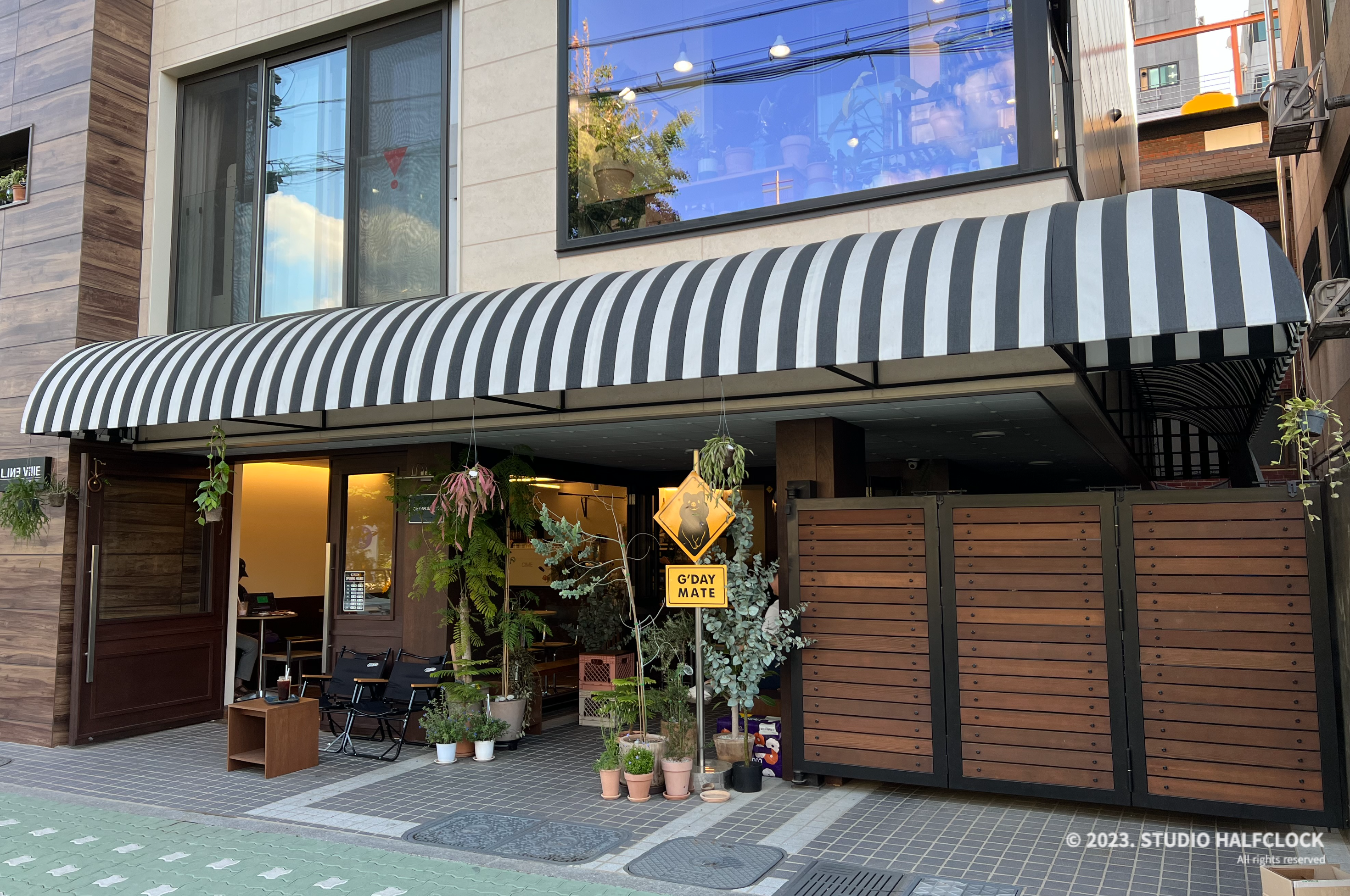 외부와 내부까지 이어지는 플랜테리어와 스트라이프 어닝이 눈길을 끈다.