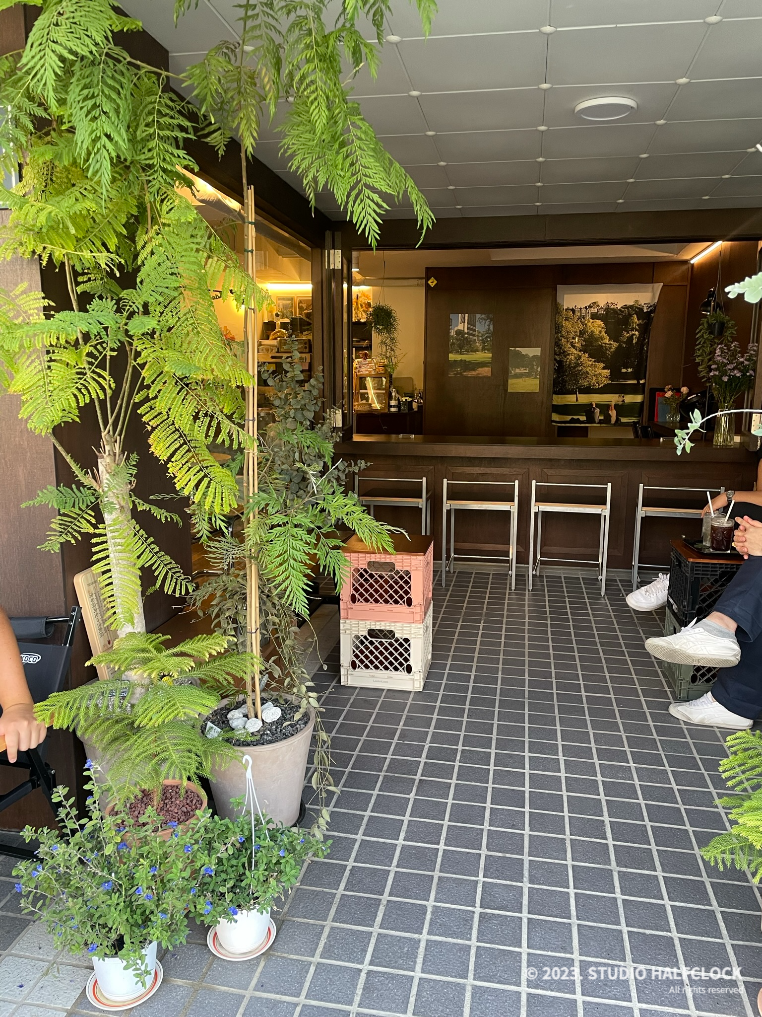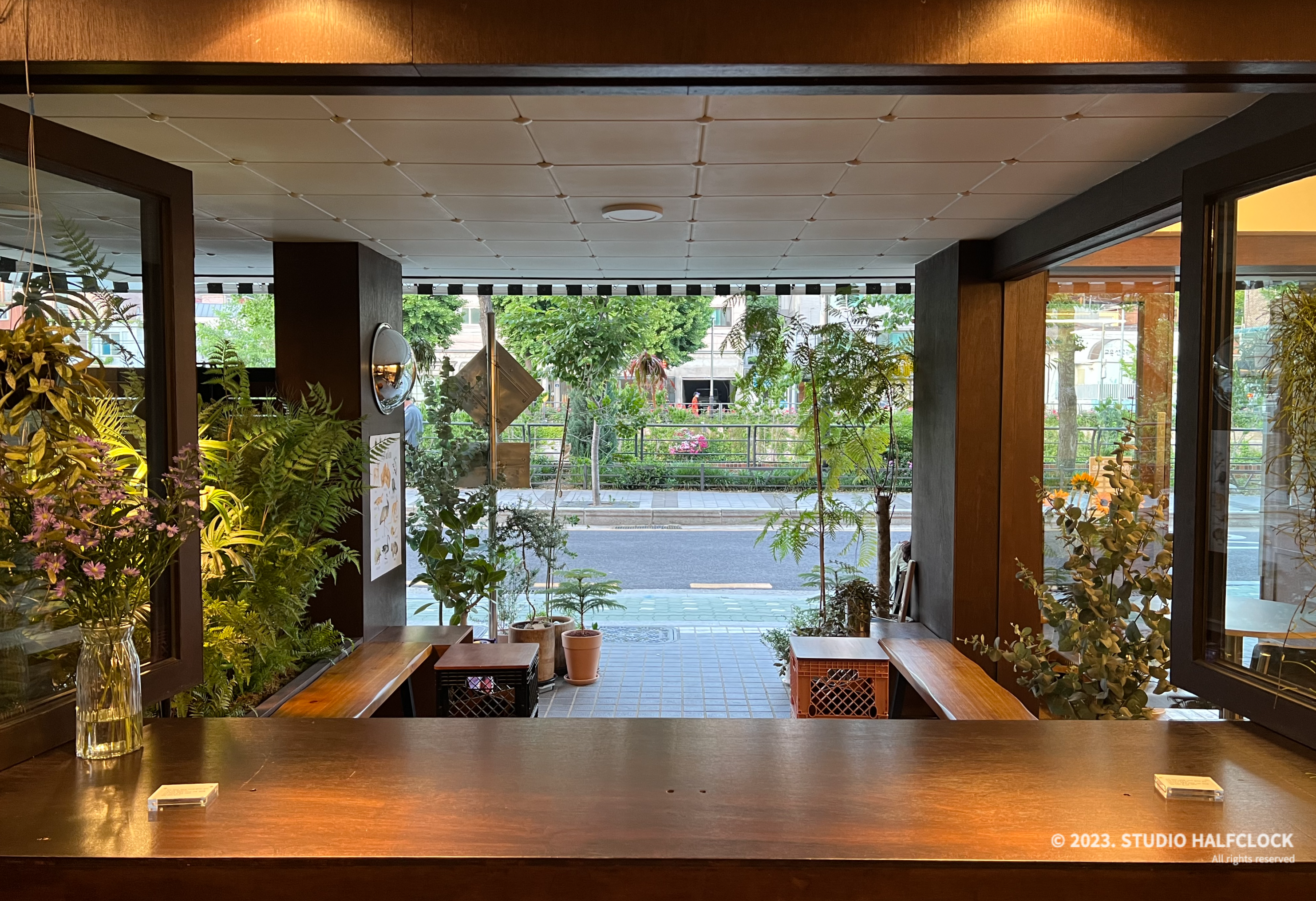 외부와 내부까지 이어지는 플랜테리어와 스트라이프 어닝이 눈길을 끈다.