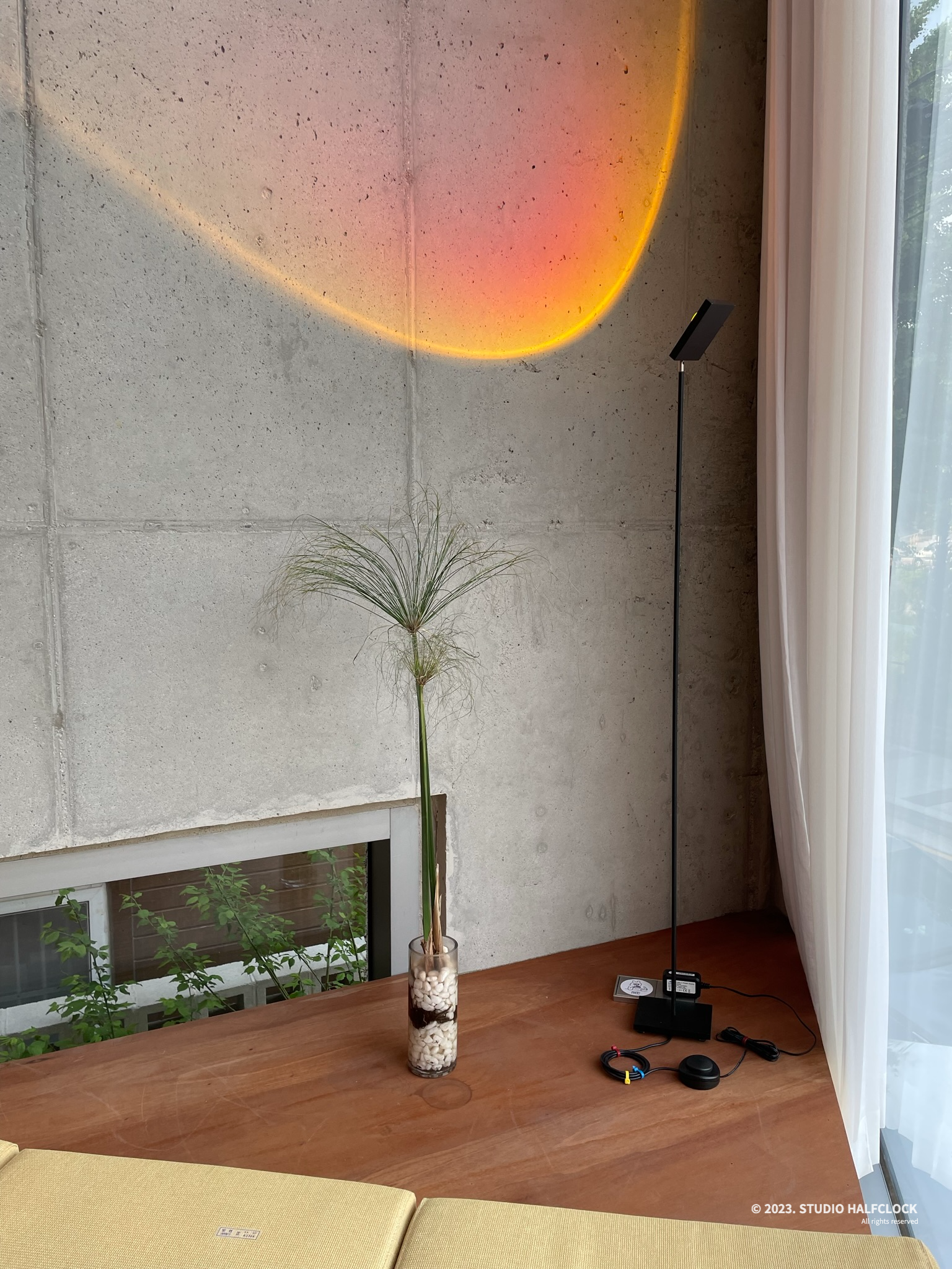 노출 콘크리트에 조명으로 따뜻한 느낌을 줬다.