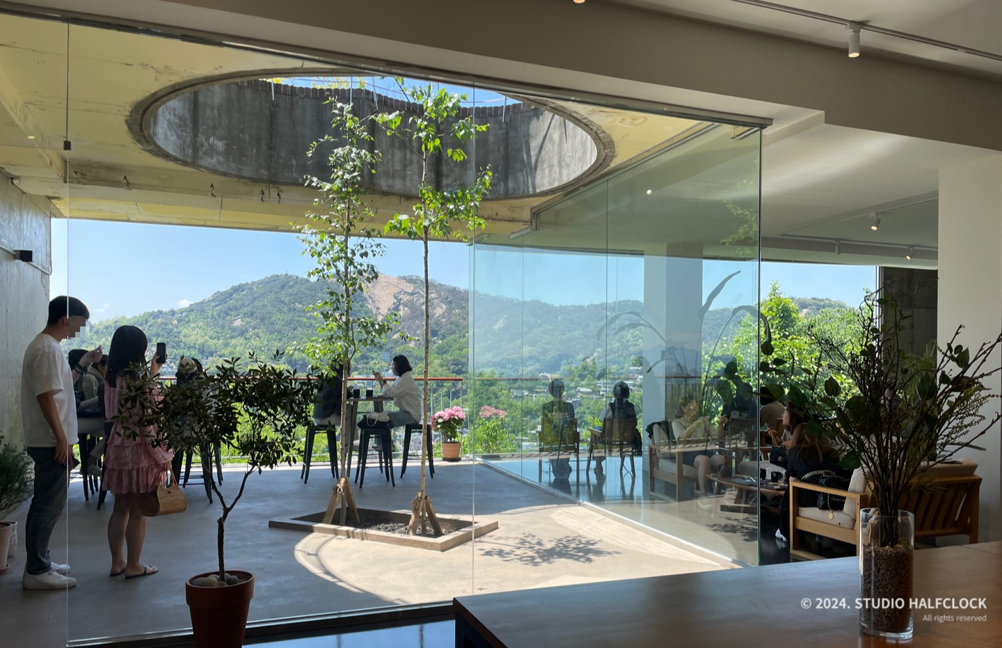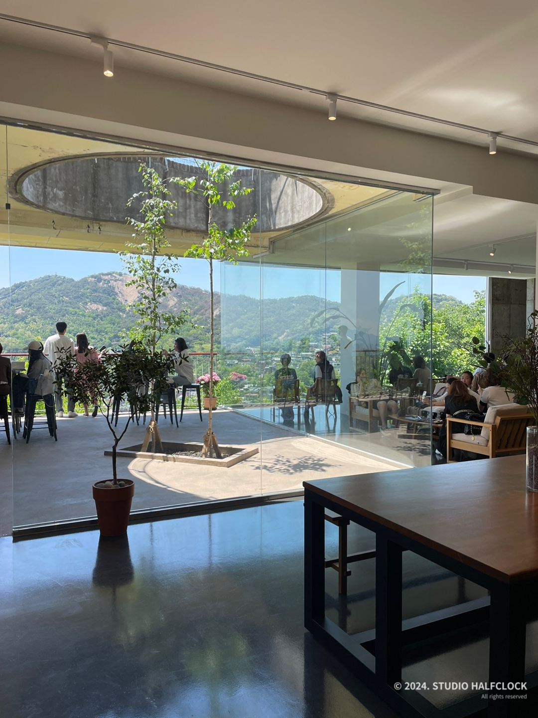 들어가자마자 통유리로 보이는 인왕산 뷰에 감탄.. 서울에도 이런 곳이 있는 게 너무 좋고 신기했습니다. 내부와 테라스 같은 외부가 있는데, 요새 날씨가 좋아서 밖에서 경치를 보며 커피 한잔 하는 게 좋았습니다.