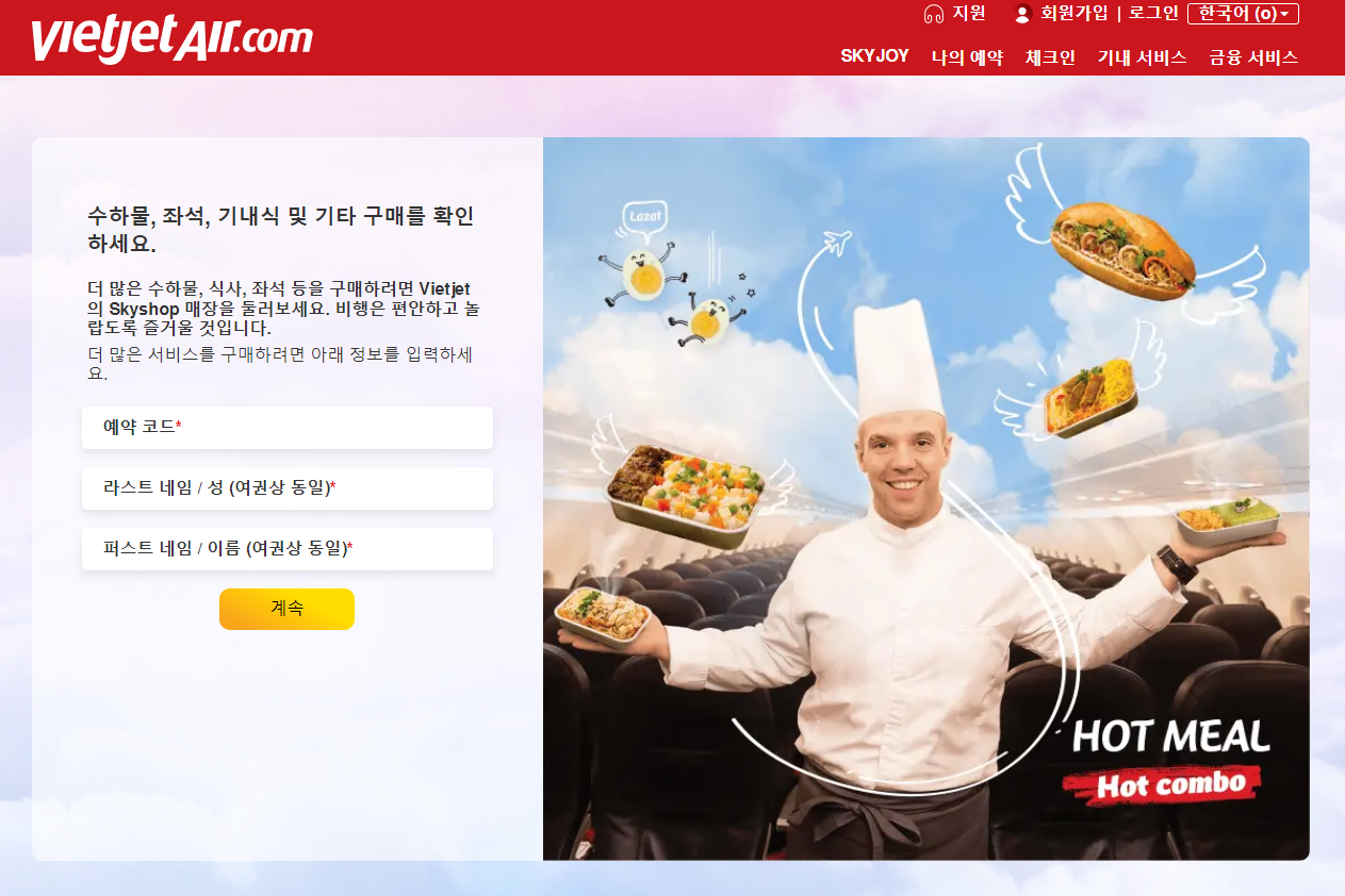 비엣젯 항공은 기본적으로 1인당 (휴대수하물 1개 + 소형 손가방 1개) 총 7kg 이내를 기내에 휴대할 수 있습니다. 조금 오래 여행한다면 추가수하물을 구매해야 하는 경우가 많습니다. 미리 수화물을 구매하는 게 가격이 더 저렴하다고 해요. 비엣젯 항공에 본인 티켓의 예약코드를 입력하면 추가 수하물 구매와 좌석 구매, 기내식 선택, 우선 체크인 서비스 등 다양한 서비스를 미리 구매할 수 있습니다. 저는 추가수하물과 좌석을 구매했습니다.