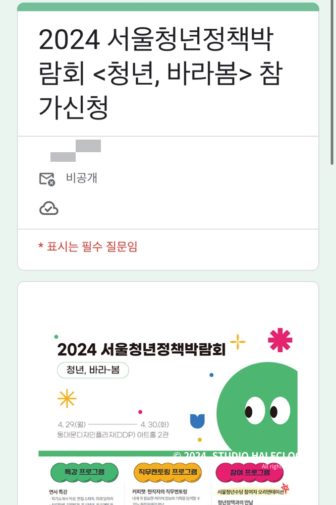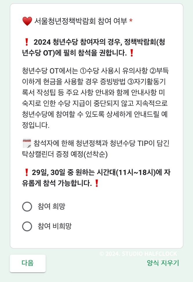29~30일이 월요일, 화요일인데, 저는 그때 알바를.. 해야 해서.. 참여 불가로 제출했습니다. 특히 2024 청년수당 참여자의 경우에는 정책박람회에 필히 참석을 권한다고 되어있는데.. 어쩔 수 없죠.. 가능하신 분들은 꼭 가보시길!