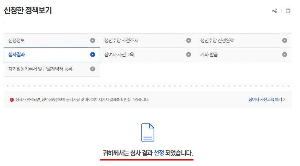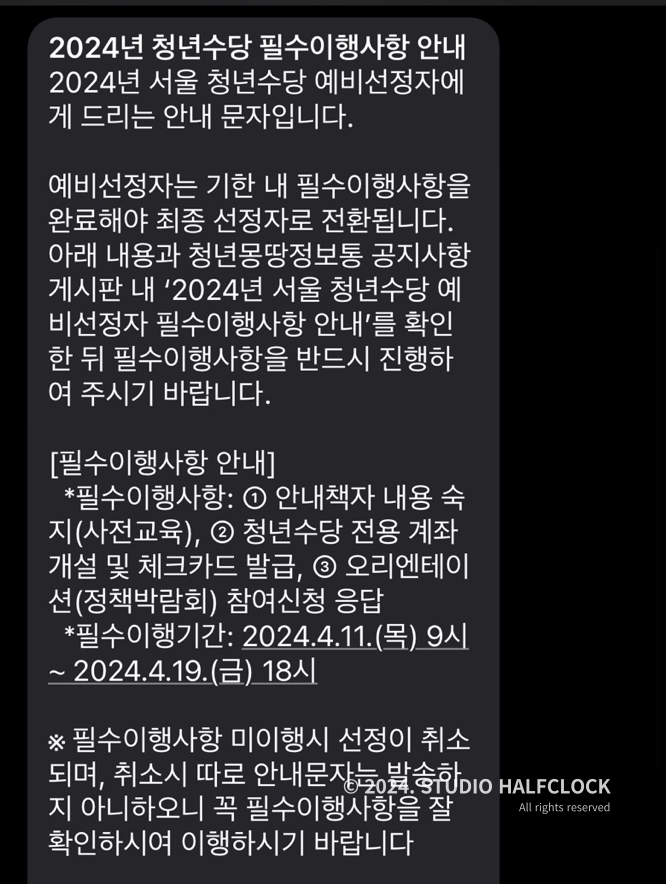 2024년도 서울 청년수당 참여자 모집공고를 지원하고 결과확인을 4월 5일 오후 6시에 했었는데, 오류 때문인지 선정결과를 볼 수가 없었어요. 근데 갑자기 문자가 와서 다시 확인해보니 선정되었다는 걸 오늘 알게 되었습니다!