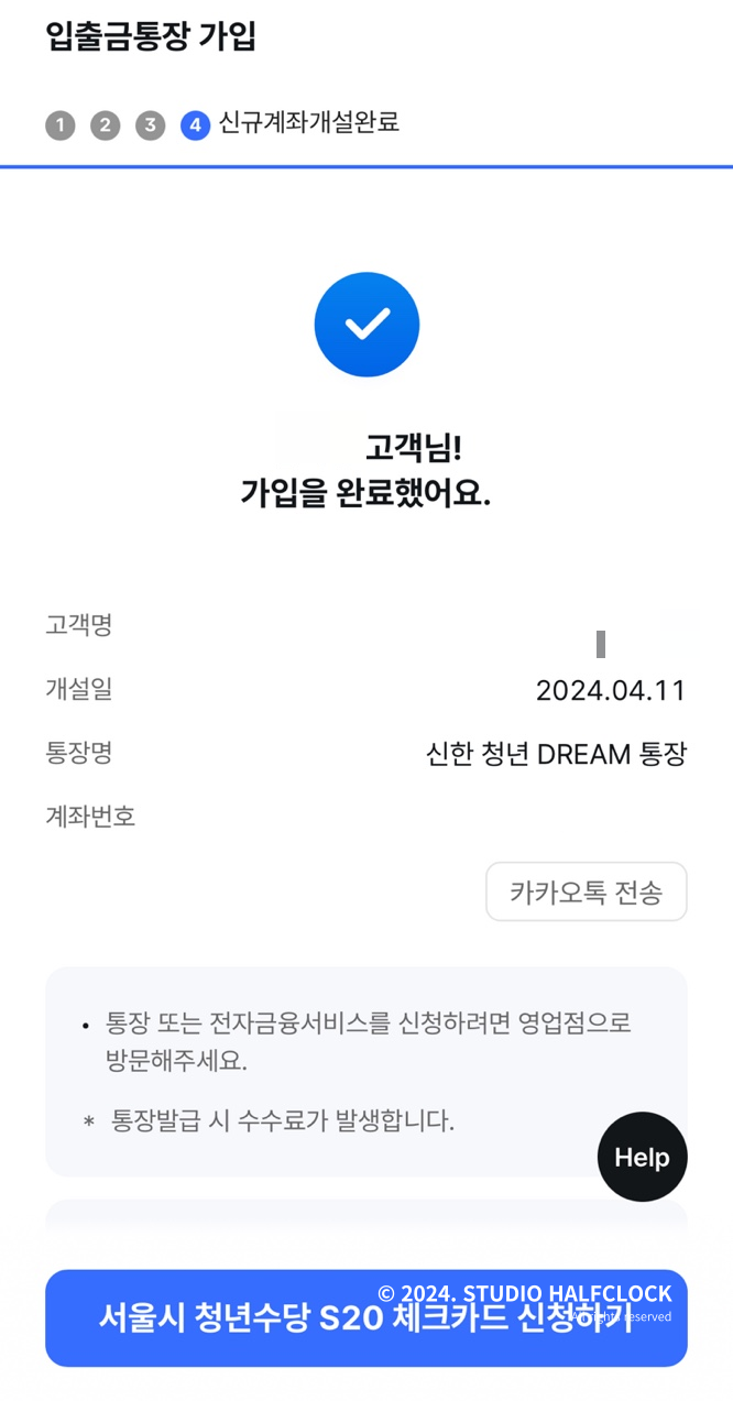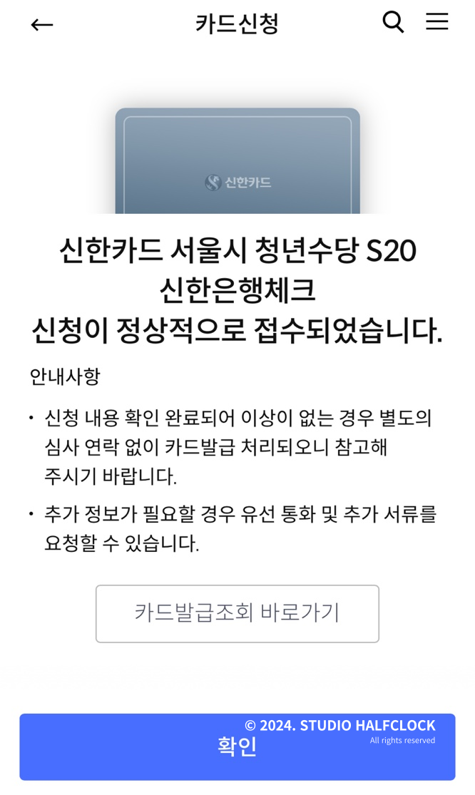 이렇게 빠르게 계좌를 만들면 아래 서울시 청년수당 S20체크카드 신청하기 버튼이 떠요! 이걸 그대로 눌러주면 바로 카드까지 한방에 개설할 수 있습니다.