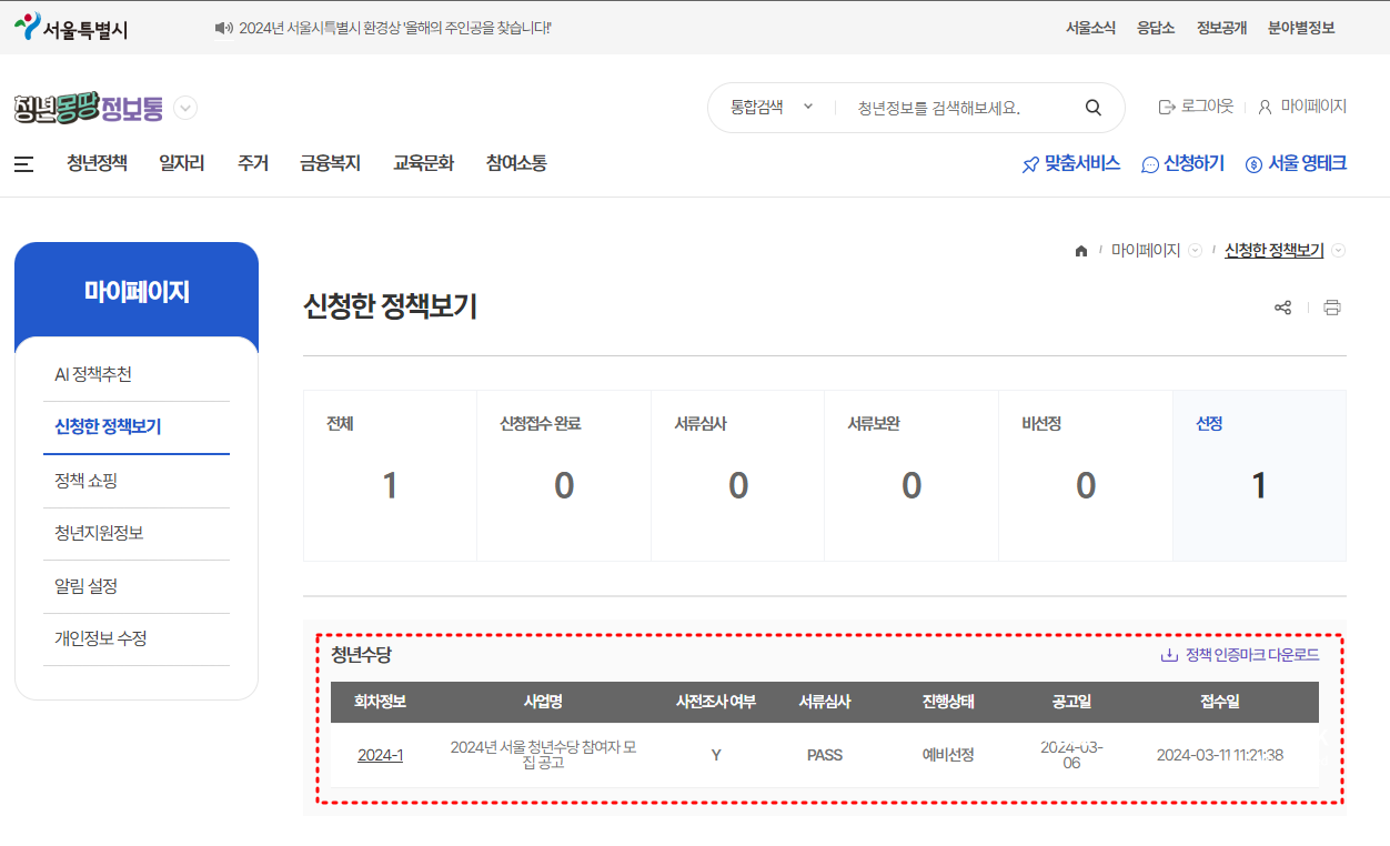 - 청년몽땅정보통 로그인 후 마이페이지에서 확인