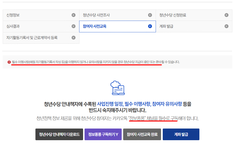 가장 먼저 참여자 사전교육에 들어가면 청년수당 안내책자를 다운로드할 수 있어요. 안내책자를 꼼꼼하게 읽어주시고 카카오톡 "정보퐁퐁"채널을 필수로 '구독'해 줘야 합니다. 그리고 참여자 사전교육 완료해 줍니다.