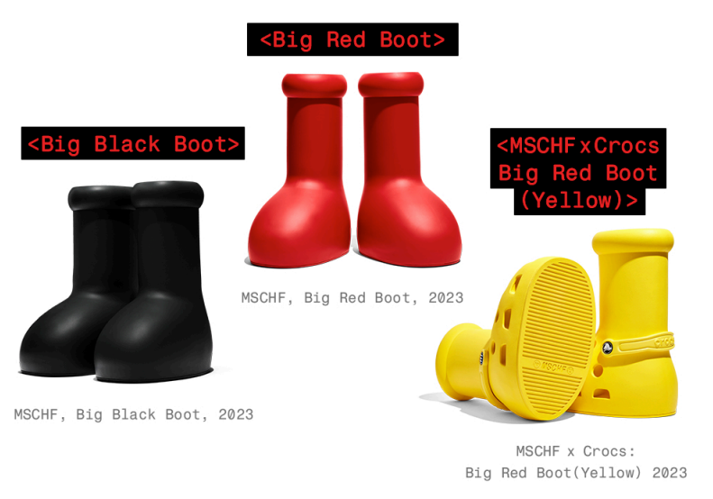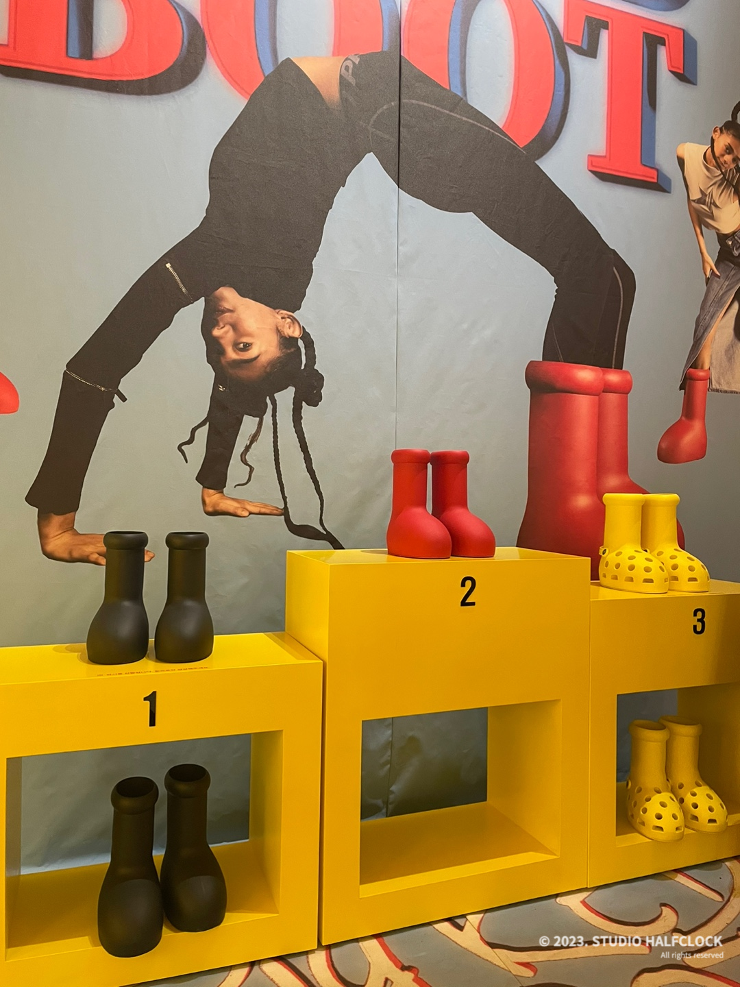 인스타에서 유명한 셀럽들이 신고 사진을 올림으로 전 세계를 뒤흔들었던 아톰부츠. 만화 속 캐릭터들의 부츠처럼 생긴 모양으로 단순화된 만화 형태에서 영감을 받은 3D 세계를 위한 부츠다. 블랙버전과 크록스와 협업하여 만든 구멍이 뚫린 노란색 버전도 있다. 이거 전시장에서 아래쪽 신발들 직접 신어볼 수 있어요. 위에 있는 신발들은 신을 수 없는데 어떤 분이 가져가서 신어서 찾느라 다들 난리였음. (위쪽 신발들은 신지 마세요)