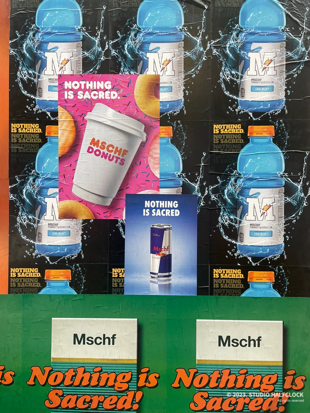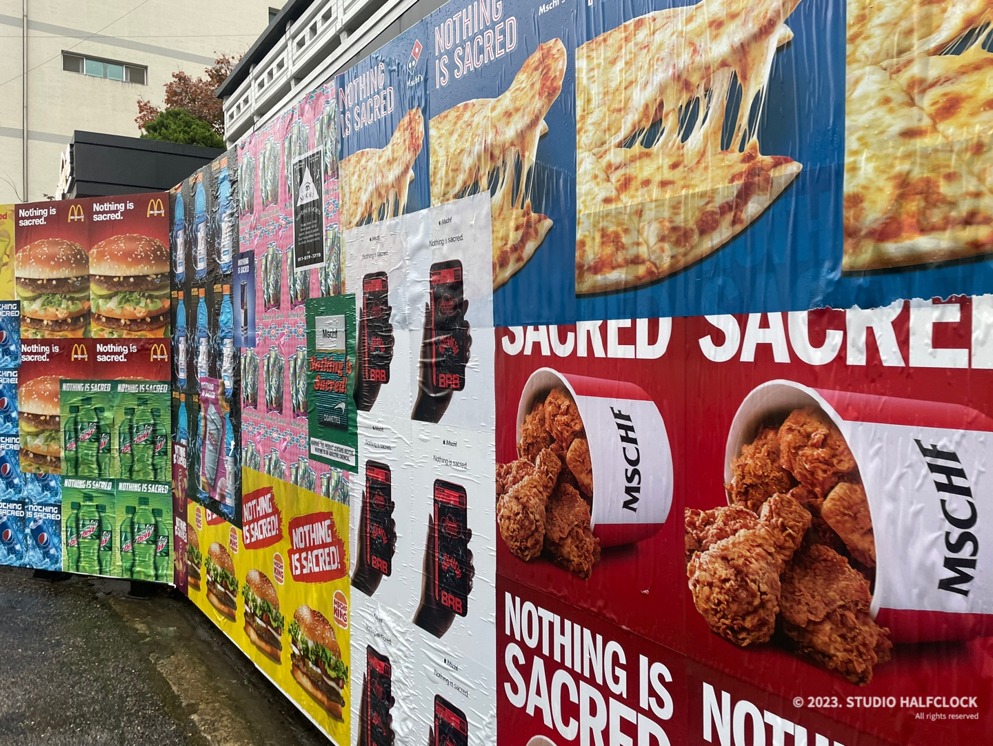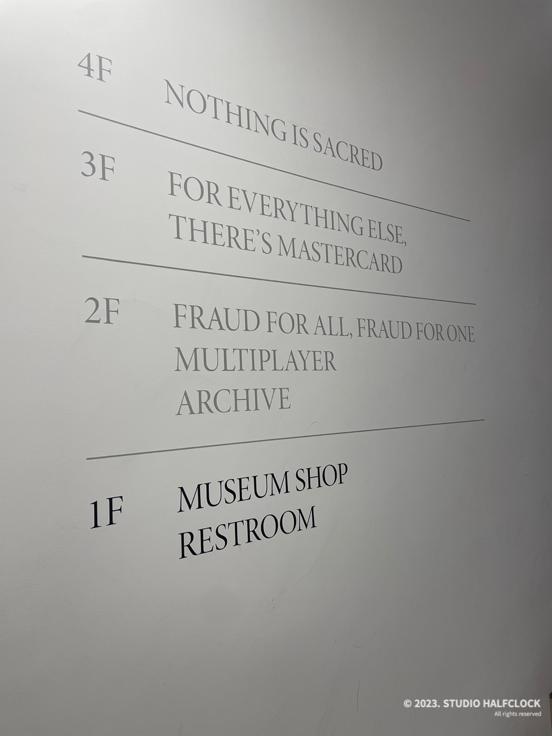 전시는 총 6가지의 주제로 구성되어 있습니다. 계단을 올라가면서 봤습니다. 2층은 주로 대중 참여형 전시로 구성되어 있어서 재미를 위주로 느낄 수 있었고 3층은 브랜드 관련 작품들을 많이 볼 수 있었습니다. 주로 현대사회에서 브랜드들이 이용하는 마케팅 전략을 위주로 비꼬는 작품들이 많았고 그런 마케팅 전략에 현혹당하는 현대인들의 모습을 되돌아볼 수 있었습니다. 4층은 '그 어떤 것도 신성시될 수 없다'는 전시의 주제를 명확하게 담고 있는 작품들로 구성되어 있었습니다. 주로 예술품, 브랜드 관련 작품들을 볼 수 있었습니다.