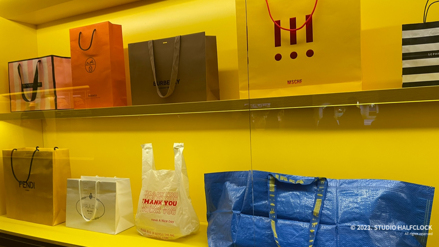 이 작품을 보면서 명품 브랜드 종이가방이 당근마켓에서 거래된다는 사실이 떠올랐다.. 브랜드들의 종이가방을 40달러에 실제로 판매하는 것으로 현대사회를 비꼬았는데 이미 한국에서는 벌어지고 있는 일...