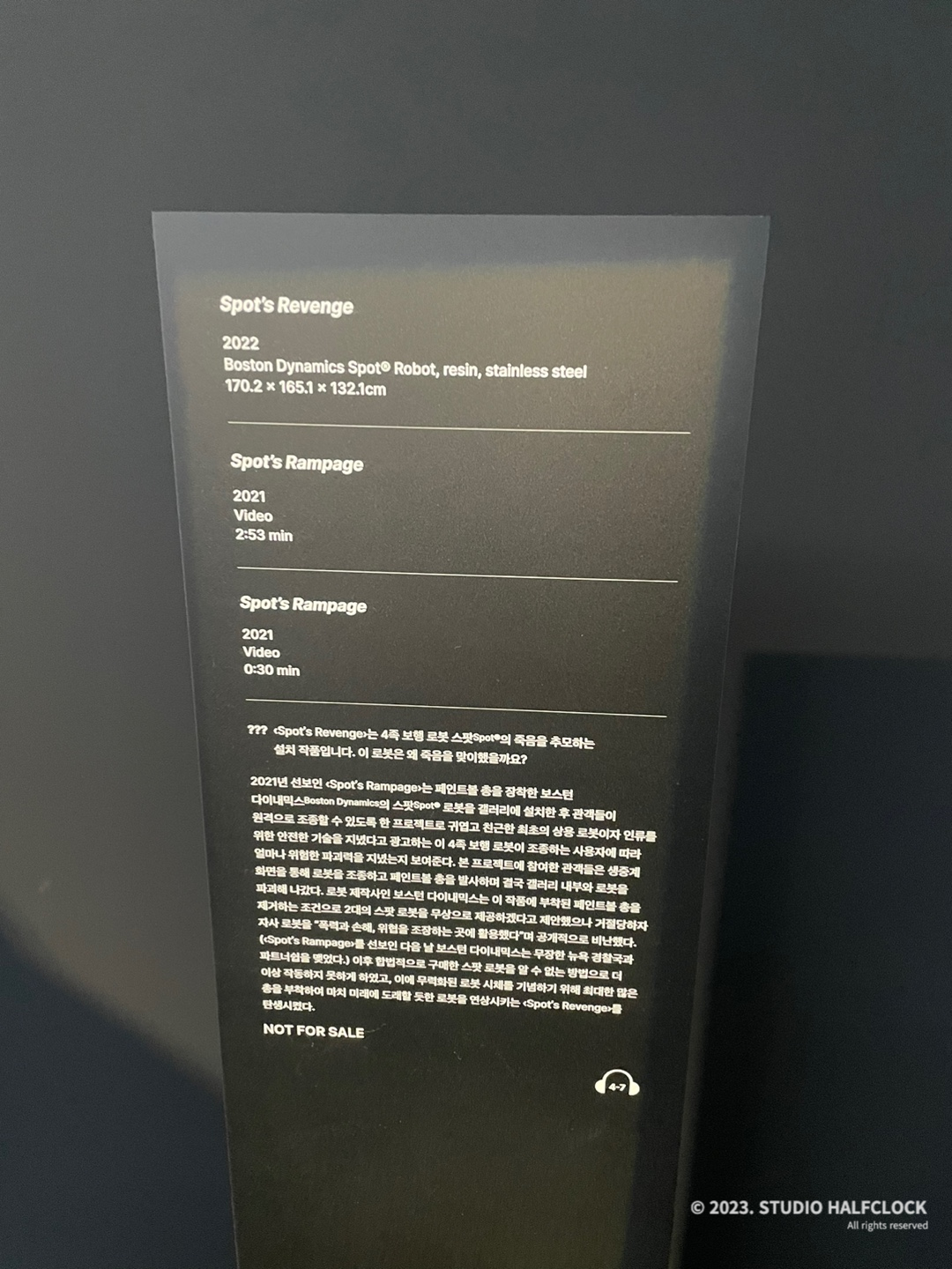 4족 보행 로봇 스팟의 죽음을 추모하는 설치 작품입니다. 2021년 선보인 <Spot's Rampage>는 페인트볼 총을 장착한 보스턴 다이내믹스의 스팟 로봇을 갤러리에 설치한 후 관객들이 원격으로 조종할 수 있도록 한 프로젝트로 귀엽고 친근한 최초의 상용 로봇이자 인류를 위한 안전한 기술을 지녔다고 광고하는 4족 보행 로봇이 조종하는 사용자에 따라 얼마나 위험한 파괴력을 지녔는지 보여줍니다.