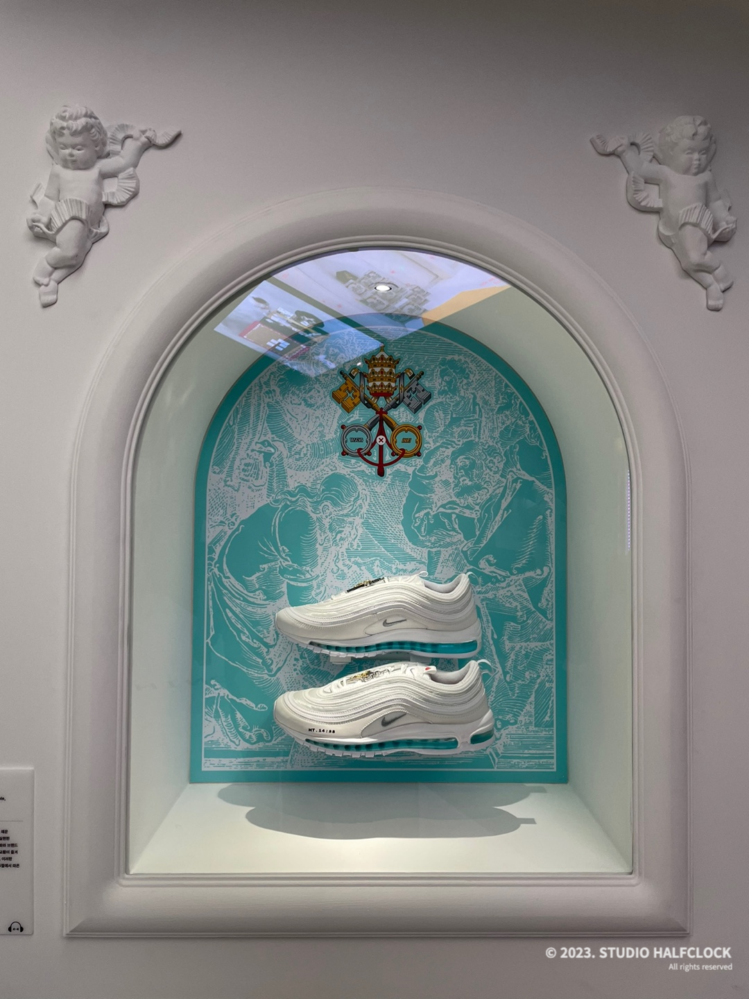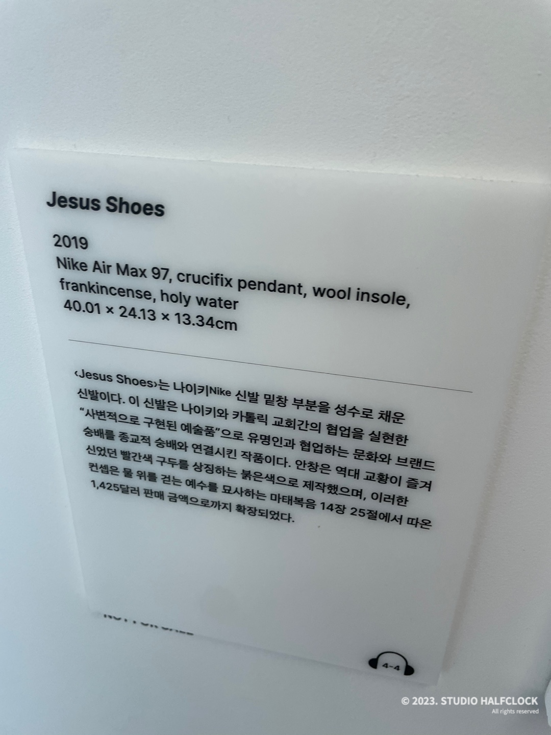 이 신발에는 실제 사제에게 축복받은 요르단 강의 성수 60cc가 들어있습니다. 이 작품을 '나이키와 가톨릭 교회와의 콜라보레이션을 실현시킨 것'이라고 표현했는데요. 브랜드를 향한 숭배 현상을 종교에 대한 신앙과 결합한 이 작품은 셀럽과의 무분별한 콜라보 현상에 대해 질문을 던집니다. 콘셉트는 물 위를 걷는 예수를 묘사하는 마태복음 14장 25절에서 따온 1,425달러 판매 금액으로까지 확장되었다.