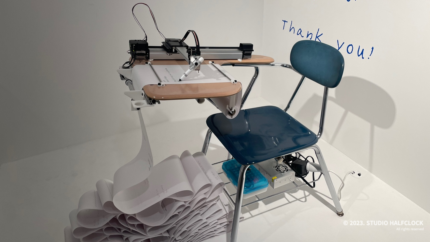 아무도 앉아있지 않지만 스스로 편지를 쓰고 있는 책상과 의자. 이 책상과 의자를 보면 학교의 아이들이 연상되는데, 삐뚤삐뚤한 글씨로 적은 편지는 아이가 적은듯한 느낌을 준다. 사용자가 제출한 메시지를 가짜 어린이 편지로 변형하여 미국 상원의원들에게 우편으로 보내는 라이브 퍼포먼스 설치물이었다고 한다. 쓰여있는 편지들 중 가장 인상 깊었던 건 미국의 총기문제로 인해 아이들이 희생당한 내용의 편지였다.