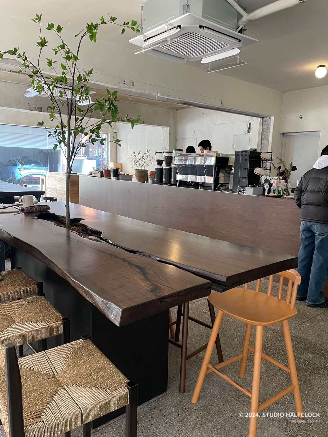 1층에 딱 들어가면 기다란 바테이블과 (원목인가요?) 주문하는 곳이 있다. 바테이블 가구가 인상적이었음.. 거기에 액세서리 파는 매대가 있는데 비슷한 분위기로 꾸며놔서 잠깐 구경하기 좋았다.