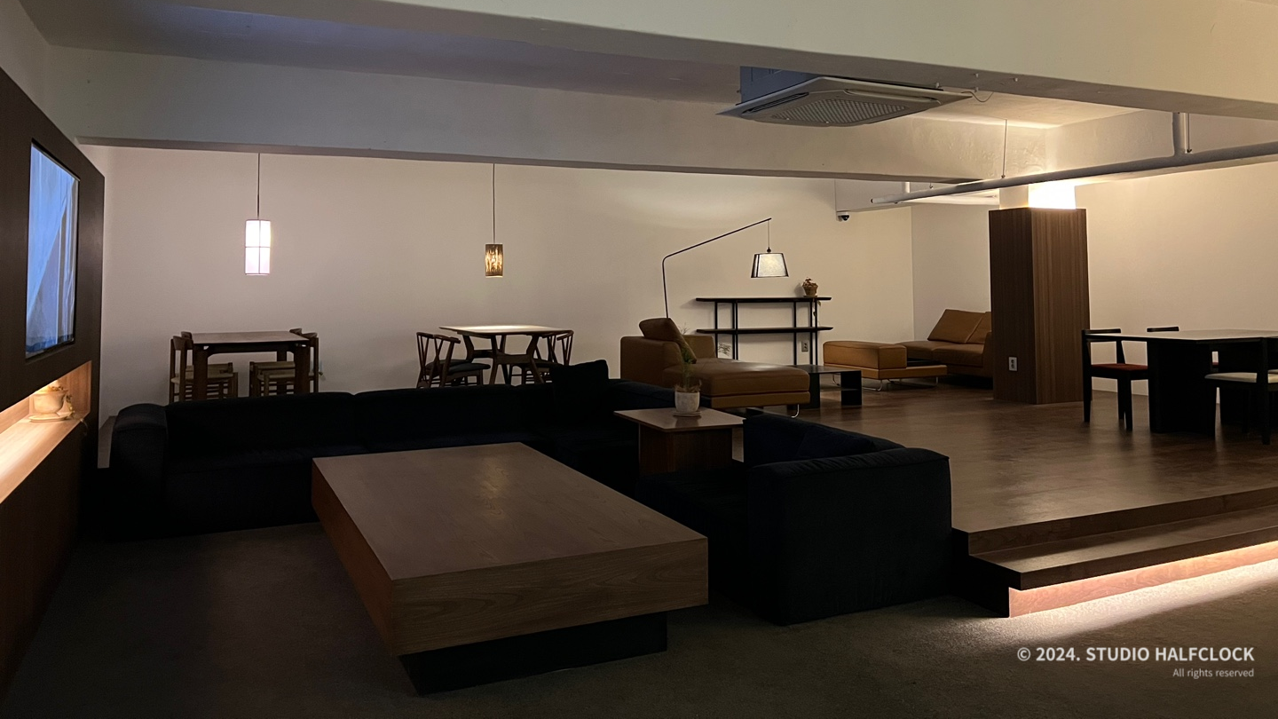 지하는 살짝 어두운 분위기로 조용하게 앉아있기 좋아 보입니다. 집 거실 같은 느낌..? 소파도 검은색으로 되어있고 톤이 조금 다운되어 보이는데 창문이 없어서 그런 것 같기도 합니다.