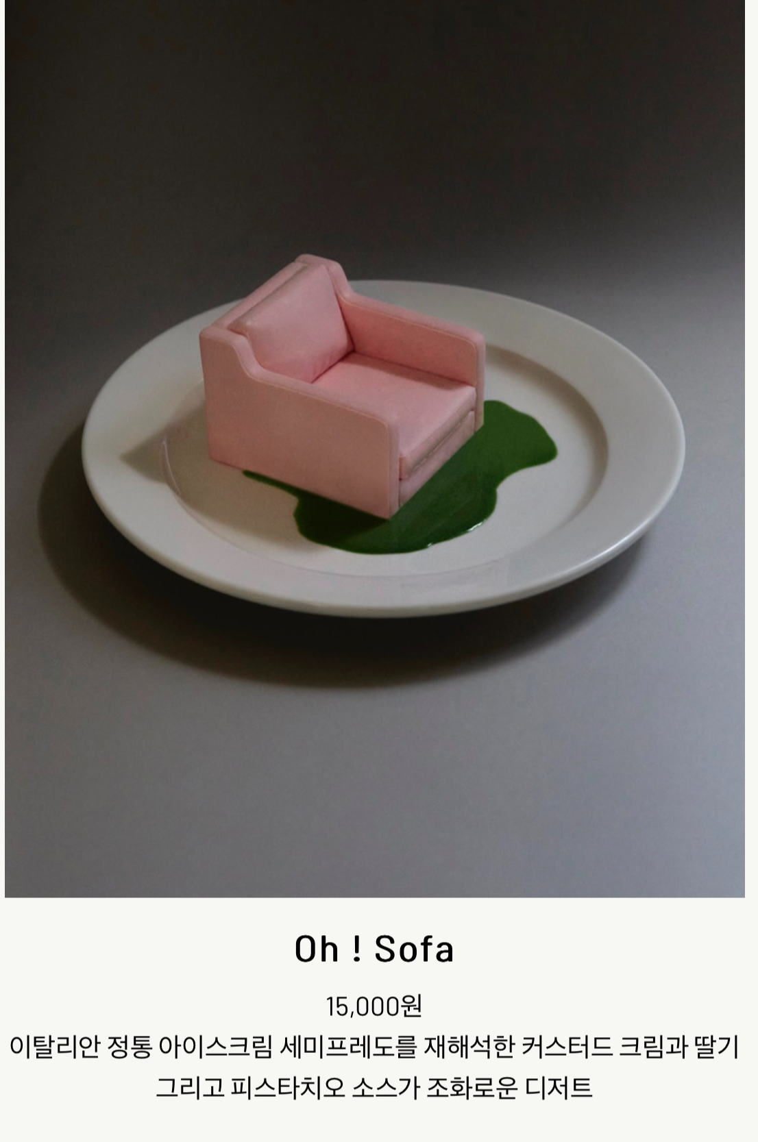 메뉴에는 크게 커피, 에이드, 디저트, 칵테일이 있다. 오!피어 메뉴도 정말 예뻤는데 개인적으로 딸기와 피스타치오를 좋아해서 오!소파를 시켰다. 딸키 생크림 케이크 맛인데 안에는 진짜 딸기가 있어서 맛있었다. 근데 너무 딱딱해서 해동하는데 좀 시간 걸림.