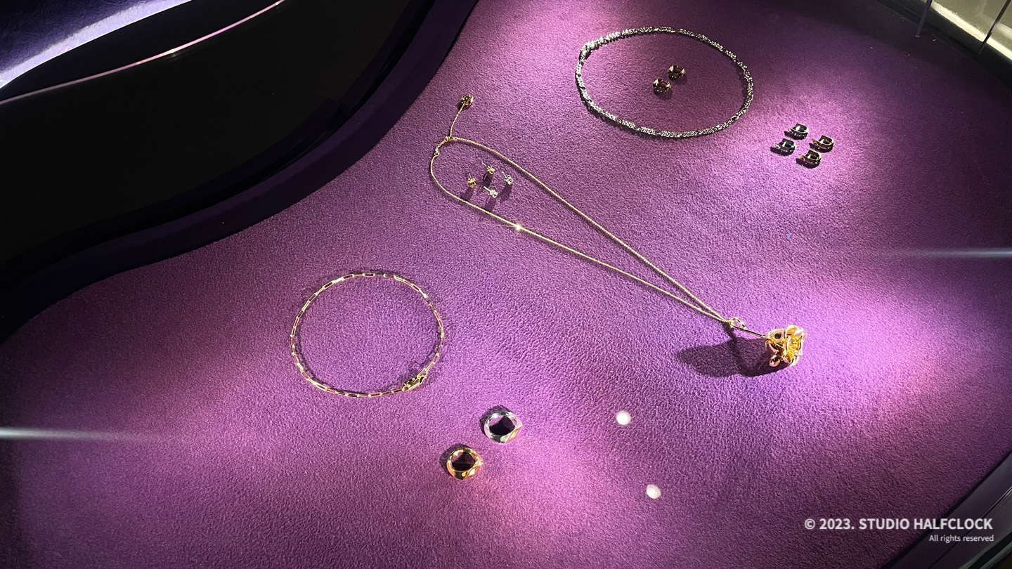 장미의 잎을 연상시키는 벽 형태와 강렬한 보라색, 보라색으로 전체를 꾸민 건 예뻤는데 살짝 눈이 피로했다. 잘못하면 가방과 옷이 잘 안 보이는.. 공간이 너무 강렬해서.. 특이한 가방과 퍼재질의 가방들을 볼 수 있었고, 디스플레이 매대가 전부 곡선이라서 보는 재미가 있었다.